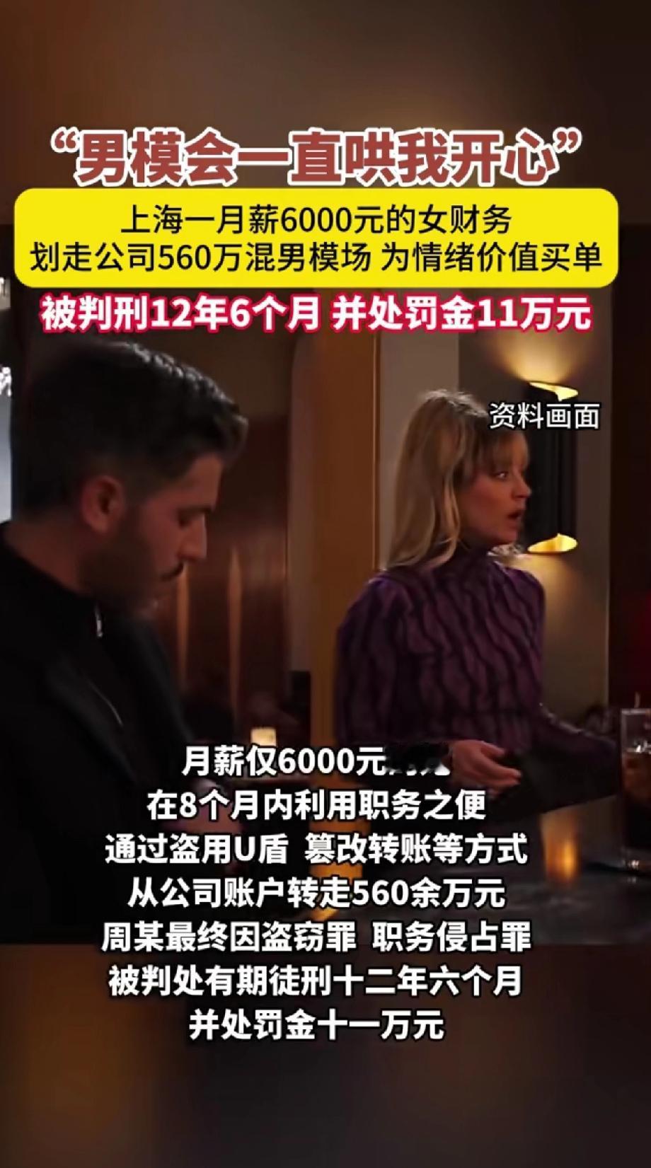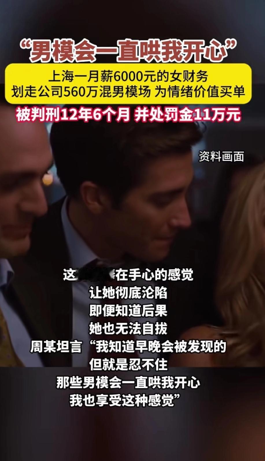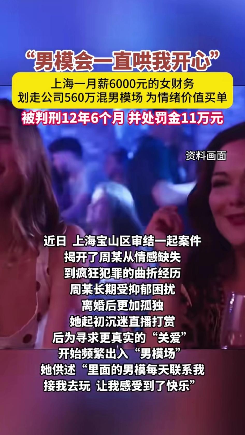 “男模会一直哄我开心”上海一月薪6000的女财务,划走公司560万混迹夜场找男模,为情绪价值买单。 最后获刑12年半。10年前母亲患病去世,她患上抑郁症,每晚靠药物助眠,和丈夫产生嫌隙,开始寄情直播,陆续打赏超100万,最终离婚独居。 起初只是网络直播打赏,后来开始频繁出入“男模场” 她供诉男模每天联系自己,接自己去玩,让自己感到非常快乐!这种被捧在手心里的感觉让她彻底沦陷,即使知道后果严重,也无法自拔爱上这种感觉。 一发不可收拾的挪用公司的钱来供养男模。 为排解孤独,她更疯狂打赏,可工资根本不够。公司账户由她管理,虽主盾老板保管,但从盾在她这。 她便动了歪心思,半年划走560多万。 有丈夫却不知道老婆打赏主播,混迹夜场的事,这夫妻俩真是过到最后过成了陌生人。 但凡丈夫多留意下 或者多关心一下老婆,也许就能避免悲剧的发生! 只能说人在面对诱惑和情感缺失时,得守住底线,不然就会像她一样,为所谓“情绪价值”付出惨痛代价