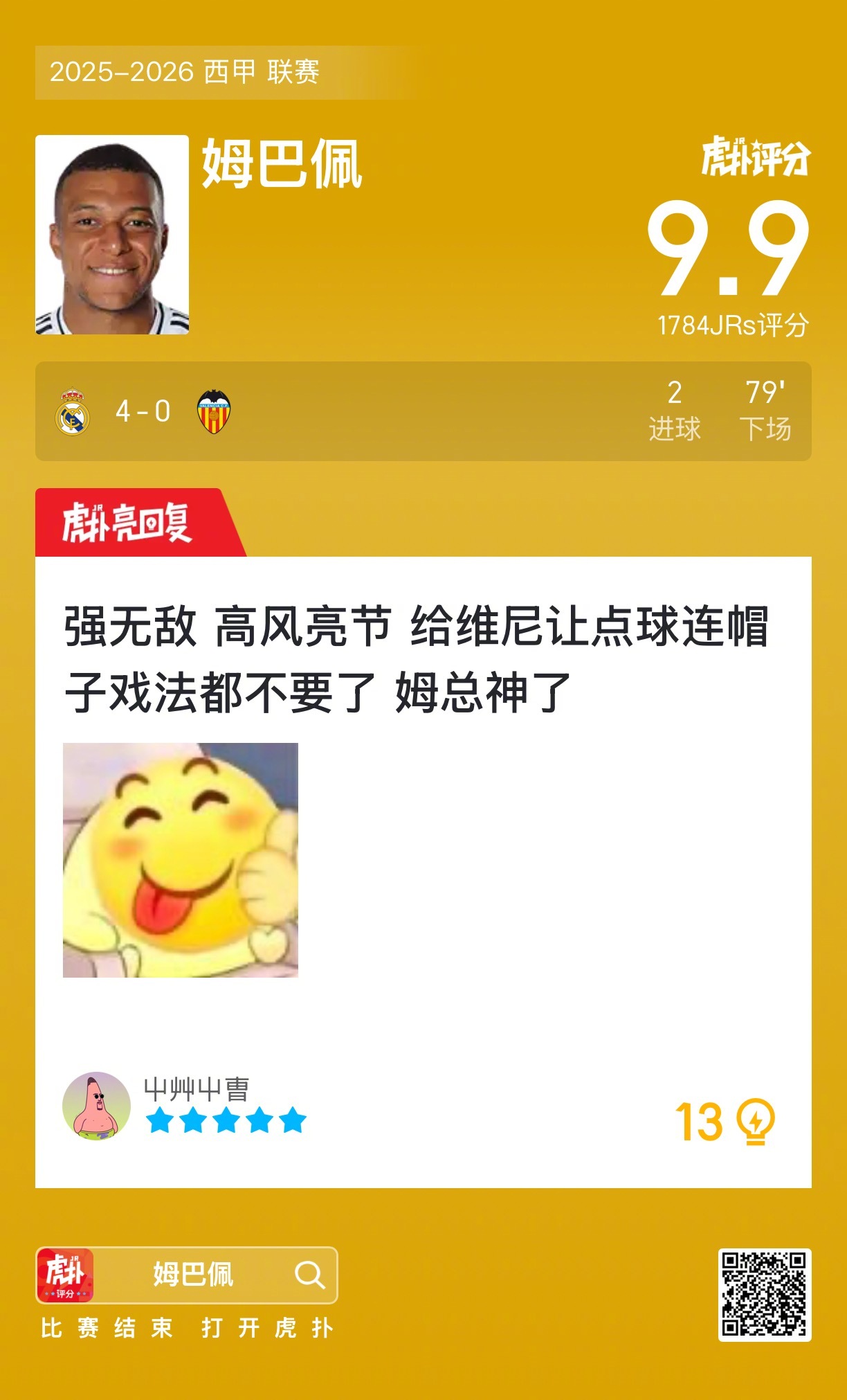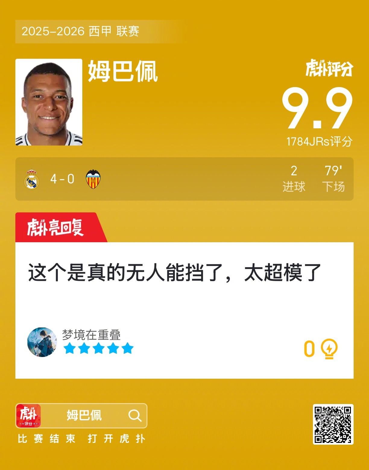 皇马4比0瓦伦西亚姆巴佩打进两球,赛后收获9.9的虎扑评分!