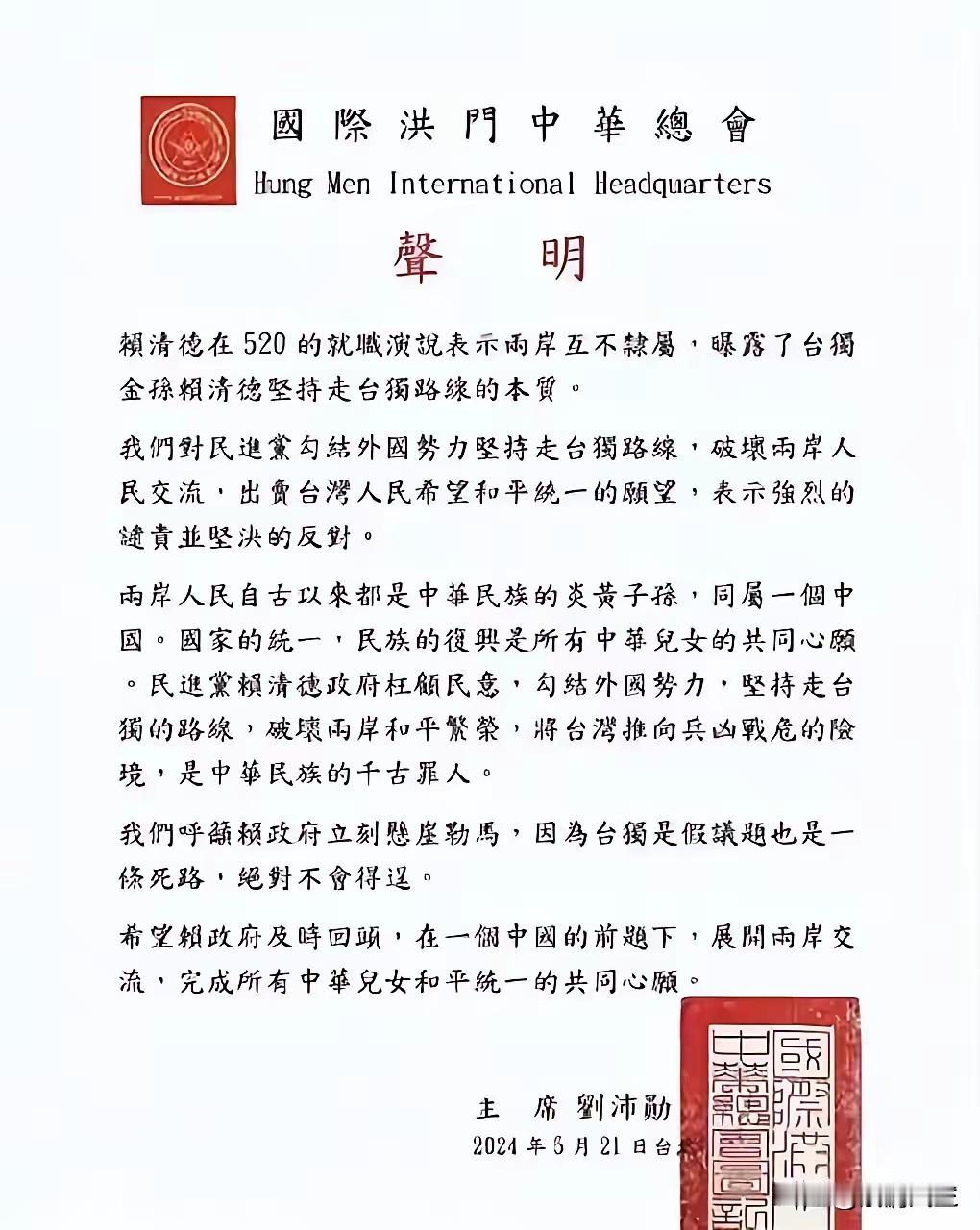 种种迹象表明,湾湾回归祖国不远了。 国际洪门中华总会下周六11.8要在台湾召开“2025坚持九二共识,维护两岸和平,促进国际统一”大会。 就看到时候,赖皮寮如何应对了!5月份洪门声明成立“锄奸队”,谁都知道洪门的实力,这对台独分子形成无形的压力! 洪门一直默默关注着祖国统一! 致公党就来自于洪门致公堂,洪门是有名的爱国组织,当年创立的目的是反清复明,洪门其实就是“洪武之门”的意思,洪武就是朱元璋的年号。 完成中华民族统一大业,是所有中华儿女的共同心愿! 面对如此猖狂的分裂势力,大陆确实应该动用一切力量,让台独分子感受什么叫乌云盖顶,惶惶不可终日。 在台内部,诸如陈馆长、洪门,郑主席等等,代表部分正义正能量正在聚集、点燃;在祖国这边,九三阅兵,光复纪念日,重拳出击精准赖氏台独分子。新的统一战线力不可摧,宝岛回到祖国的怀抱指日可待!