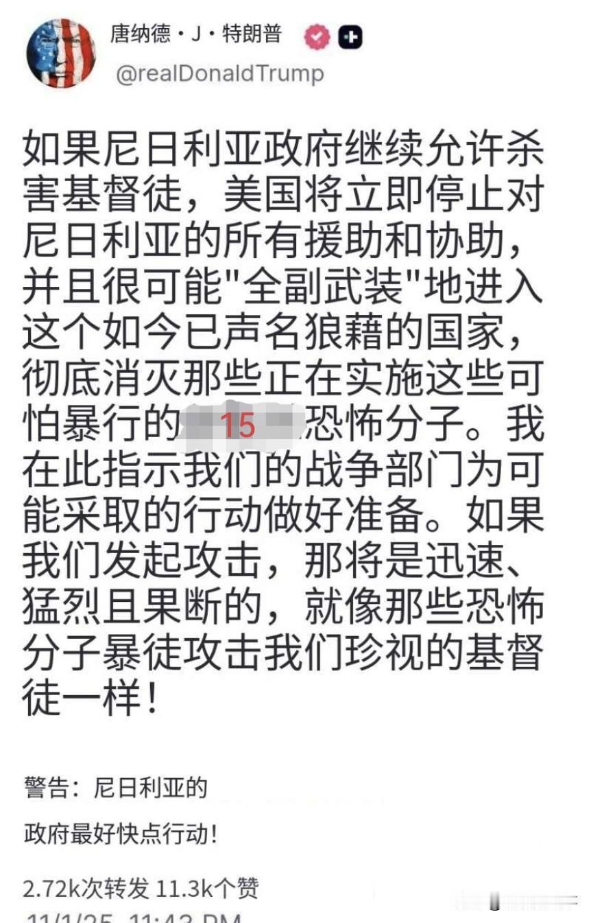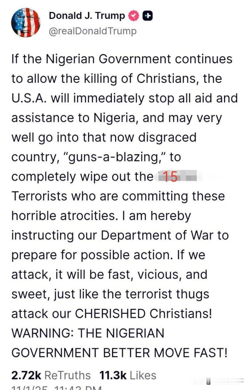 美国总统特朗普威胁称,如果尼日利亚政府继续允许杀害基督徒,美国将立即停止对尼日利亚的所有援助,并且很可能采取军事行动,以消灭参与杀害基督徒的恐怖分子。 尼日利亚 尼日利亚现状 尼日利亚恐袭 尼日利亚袭击 尼日利亚局势
