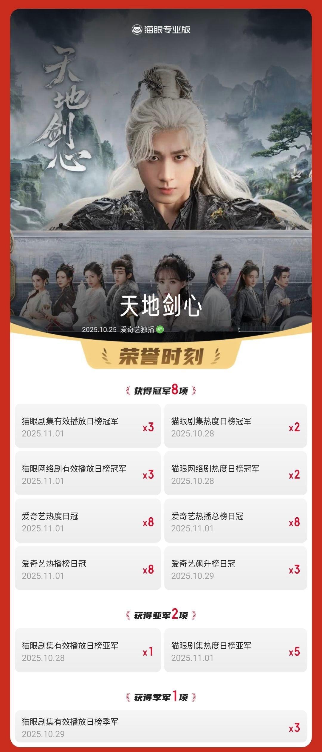 剧集天地剑心[超话]天地剑心累计3次登顶有效播放榜 据猫眼专业版数据,领衔主演网络剧《天地剑心》累计3次登顶有效播放日榜!