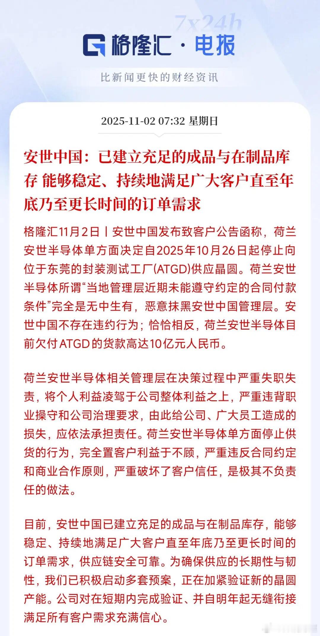 安世半导体发布了最新公告,安世中国的半导体储备充足,完全能够供应中国内的客户。