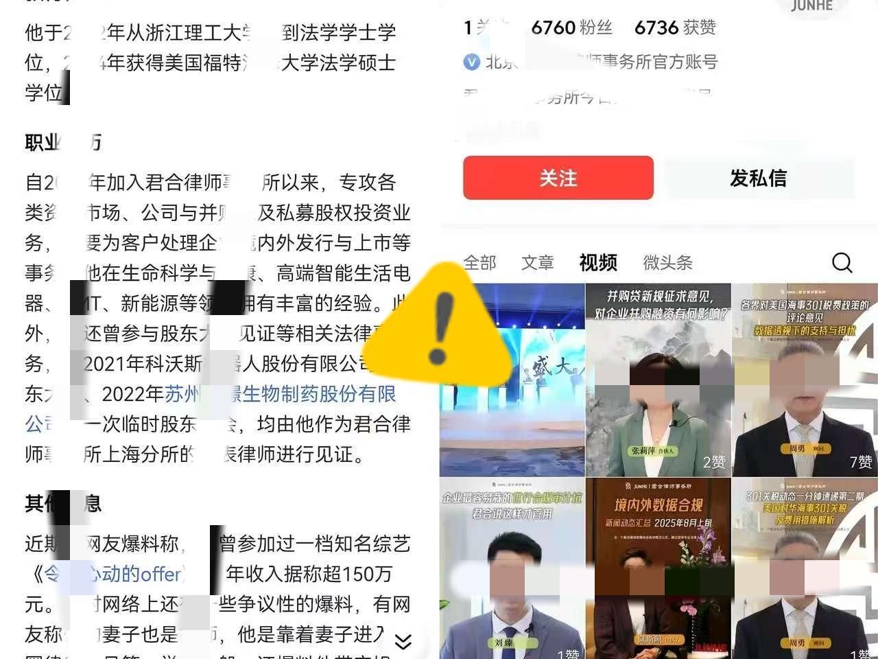 君合律师许晟骜 东航乘务长王文洁 俩名字一绑,直接把这家35年老牌律所拽出了法律圈,以最尴尬的姿势“破圈”了! 谁能想到啊,君合手握美团发债、万达并购这种百亿级项目,拿过法律科技大奖,却没靠这些硬核成绩火,反倒因员工私人争议成了大众谈资 。更讽刺的是,这不是它第一次翻车,前一年还因IPO核查不到位被深交所三次点名警告! 所谓行业标杆,不该只靠大项目撑场面。专业口碑是底色,可员工的职业底线、内部的风险把控,才是撑住口碑的基石。大众骂的不只是私人纠纷,更是对“顶尖律所”光环下专业与德行失衡的失望! 你说,比起丢项目、挨监管,这种戳破行业滤镜的“出圈”,是不是更让老牌律所疼?
