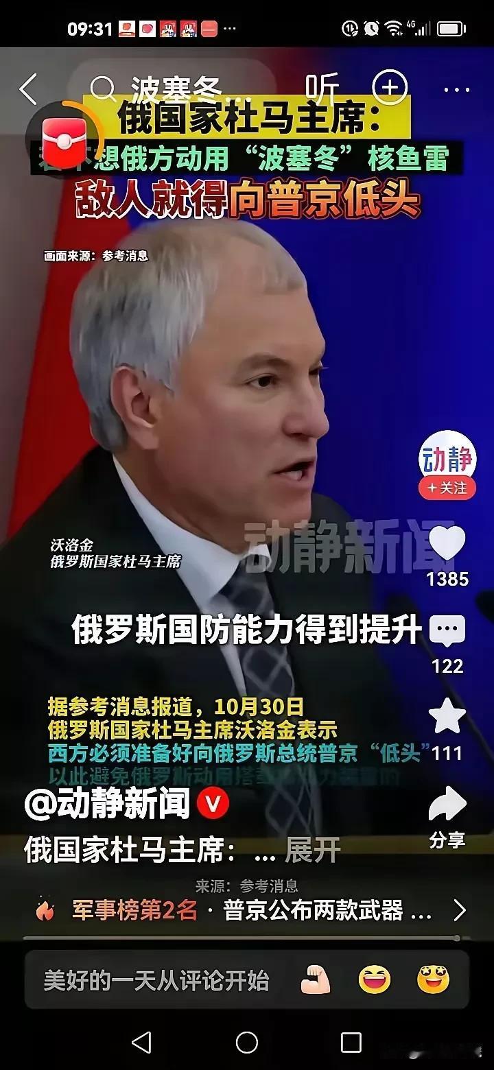 俄高级官员沃洛金表示,若要让俄罗斯不动用“波塞冬”核鱼雷,就得向普京总统低头认错。 评一句: 咋一看,这个话听起来挺提气,不得了,但实际上毫无力量、毫无意义,徒增笑耳罢了。 这种不讲公理、不讲道理、不讲正义良知,只会一味咆哮,发出不可一世的怪话,是不会得到国际社会认同的,只会让别人厌恶,并对其贴上胡搅蛮缠、野蛮十足的标签。 在二十一世纪的今天,试问,谁敢与这样一个无视国际法和国际安全的国家深度合作,这种论调不仅得不到国际社会支持,只会与国际社会渐行渐远,沦为国际社会的边角料,迟早消失在人类历史发展的长河中。