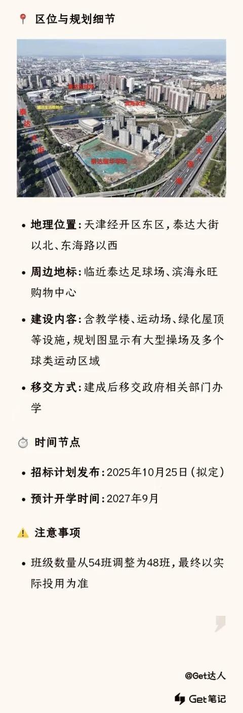 泰达第二所耀华学校🏫2027年开学啦! 🏫滨城家长集合!第二所「耀华中学」规划曝光啦!2027年开学🎒 刚刷到泰达耀华学校规划方案公示,作为天津家长真的坐不住了!这可是继和平耀华后,滨城第二所挂"耀华"牌的学校,九年一贯制(小学+初中),住经开区的宝子们快码住👇 📍先看位置: 就在天津经开区东区!泰达大街以北、东海路以西(地图搜"泰达足球场"附近,航拍图里绿色围挡那块就是),周边居民区密集,以后上学太方便啦~ 🏗️学校规模有多大? ▫️总占地约3.3万㎡(≈4.6个标准足球场),总建面5.3万㎡,地上3.3万㎡+地下2万㎡(地下空间可能做停车场/活动区?) ▫️规划48个班(之前传54班,略减但依旧能满足周边入学需求),小学到初中一站式搞定,不用愁小升初啦~ ▫️效果图长这样👉红砖墙+绿色屋顶,现代感满满,还有超大操场和活动区,目测硬件不会差! ⏰什么时候能开学? 划重点!预计2027年9月投用!现在规划刚公示,后续施工、招生政