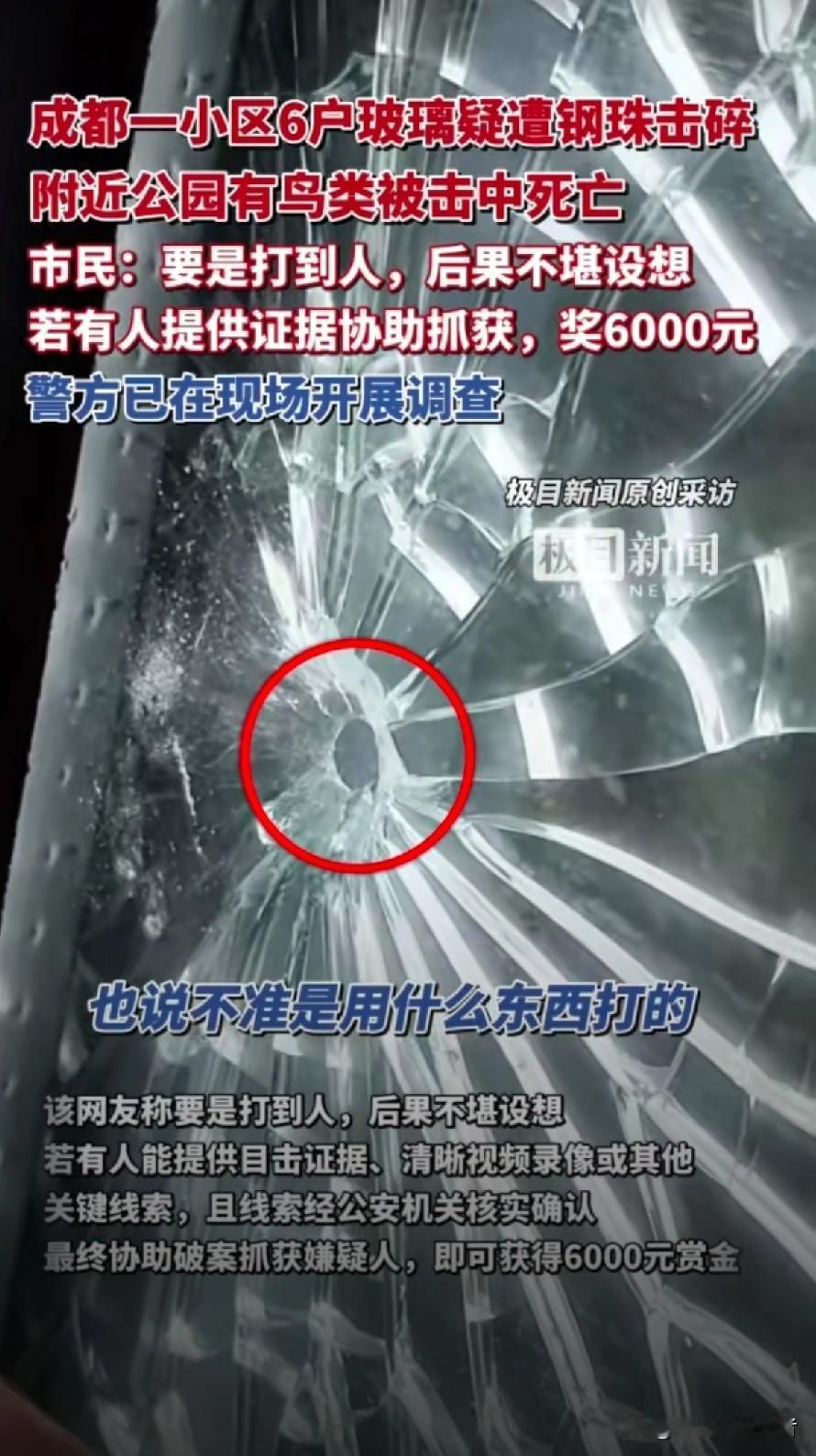 这种距离击穿玻璃的钢珠应该是什么什么东西打错的呢? 那住户的玻璃一般都是钢化玻璃,硬度还是比较高的,那么远的距离能够击穿力度应该非常的大, 弹弓也是有可能的,还有一种就是那种改装过的仿真枪也是有可能的,到底是哪一种呢?只有等待成都警方的深入调查了。