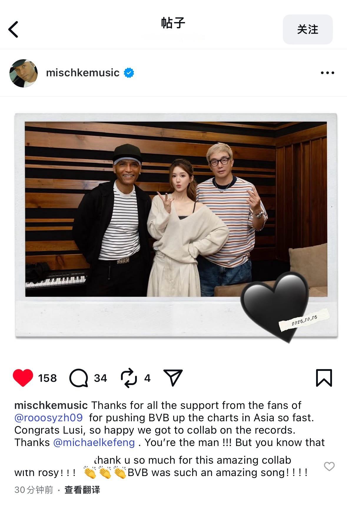制作人Mischke Butler在ins更新和赵露思女士的这次的超开心合作…老师也很惊讶这次合作上了榜单速度之快[挤眼][拳头]