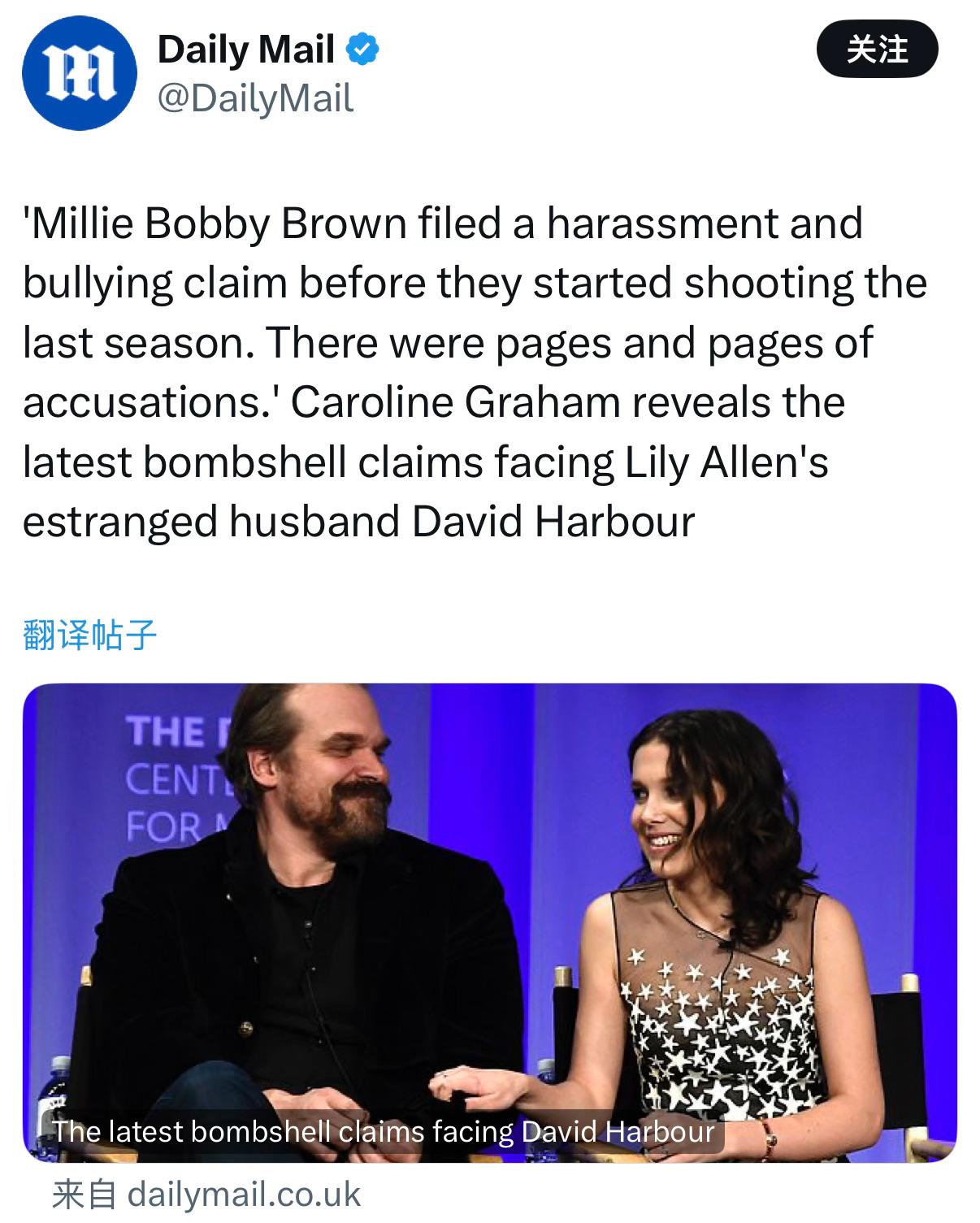 小11指控怪奇物语警长演员骚扰 what???据《每日邮报》,“小11”米莉·波比·布朗在《怪奇物语》最终季开拍前,指控剧中警长扮演者大卫·哈伯对她进行骚扰与霸凌。知情人士透露米莉在最后一季开拍前提交的骚扰和霸凌指控材料多达数页,剧组就此展开了长达数月的内部调查。目前双方均为发表公开声明。