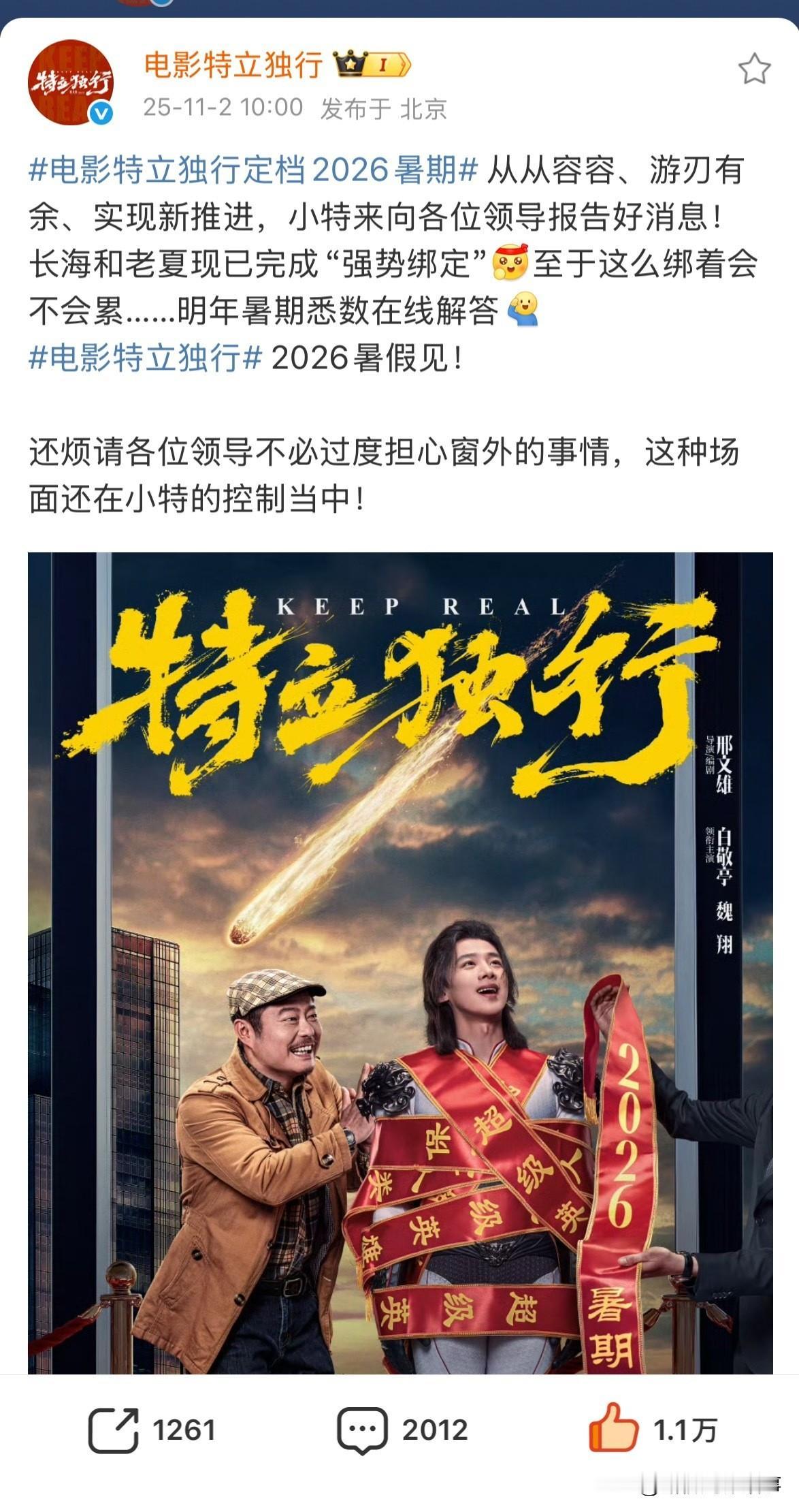 《特立独行》定档:白敬亭魏翔的喜剧暴击 邢文雄执导的《特立独行》官宣2026暑期档,白敬亭、魏翔的“心眼守恒”组合自带笑点——0心眼超人新人撞上800心眼职场老油条,上演“整顿职场”名场面。 科幻设定混搭人情世故的黑色幽默,直给式笑点戳中期待。喜剧向来是票房黑马,这部提前定档的新作,无疑是明年暑期的必看选项。