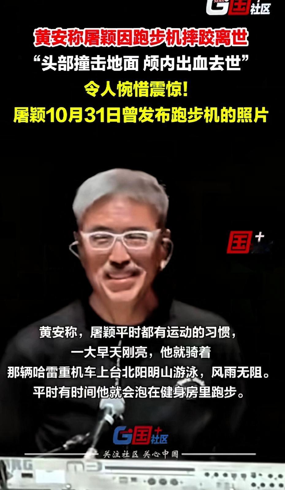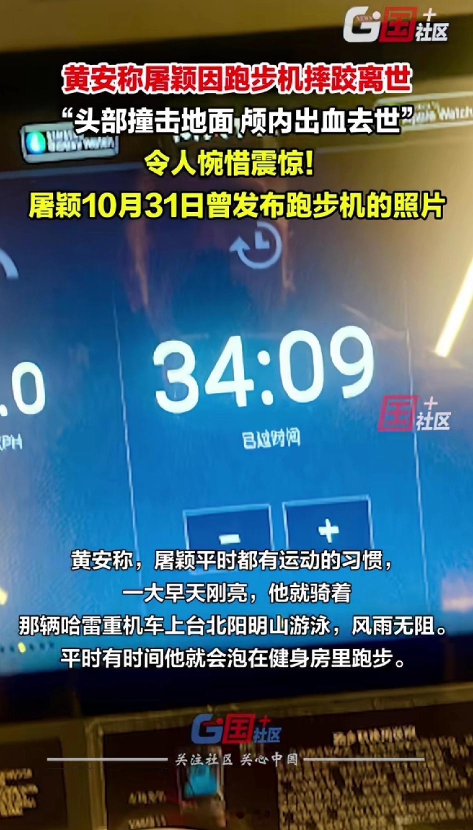 黄安称屠颖因跑步机摔倒离世,“头不撞击地面 颅内出血离世”! 11月2日歌手黄安发文,透露音乐人屠颖10月31日在酒店跑步机上跑步时摔跤,头部撞地颅内出血离世。 就在当天早晨10点,屠颖还发了自己在跑步机上的照片,上午还更新微博分享广州美食美景,谁能想到意外突然降临。 屠颖是知名编曲家,参与制作超两千首华语流行音乐,林志颖、张学友、辛晓琪等歌手的经典歌曲都出自他手。 他平时热爱运动,一大早会骑车去游泳,有空就泡健身房。 这种离开方式真是令人唏嘘,明明是一个热爱生活,热爱健身的人,却在跑步机上绊倒离世 他还有收藏模型的爱好,还投资烘焙店。这么有才华又热爱生活的人走了,实在太可惜。 任何人无法逃避生命的轮回,热爱健身却因健身离世,说不清这是宿命还是意外!