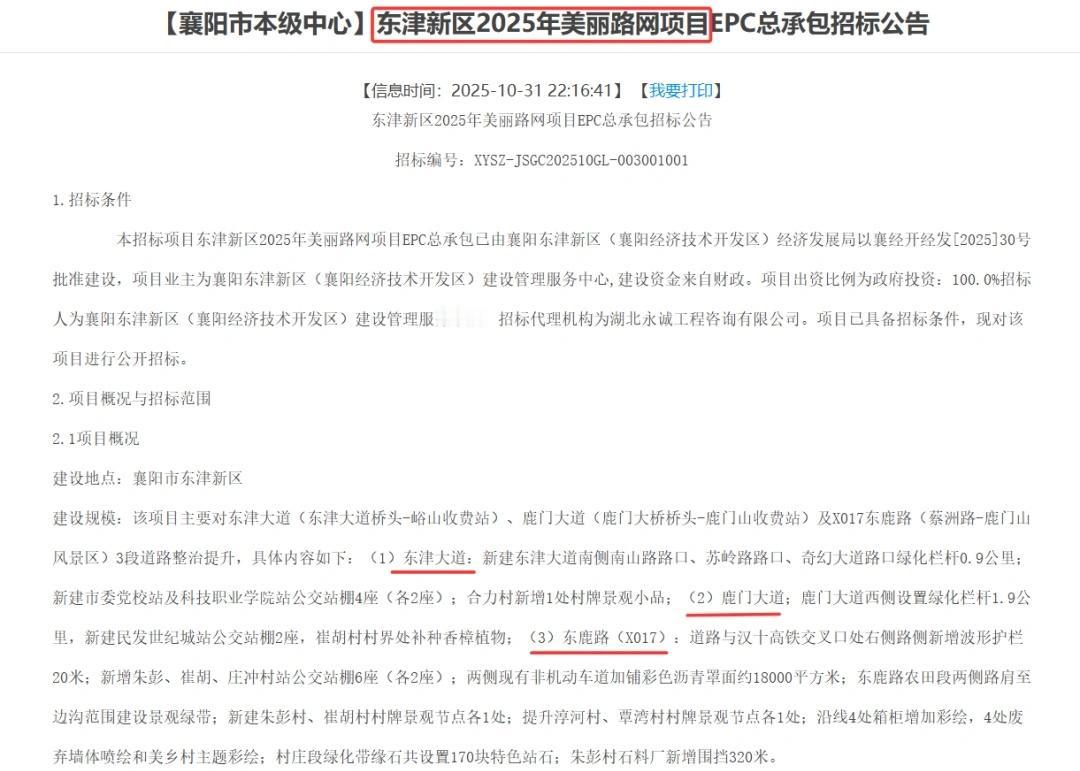 襄阳市东津新区2025年美丽路网 建设地点:襄阳市东津新区 建设规模:该项目主要对东津大道(东津大道桥头-峪山收费站)、鹿门大道(鹿门大桥桥头-鹿门山收费站)及X017东鹿路(蔡洲路-鹿门山 风景区)3段道路整治提升,具体内容如下: (1)东津大道:新建东津大道南侧南山路路口、苏岭路路口、奇幻大道路口绿化栏杆0.9公里; 新建市委党校站及科技职业学院站公交站棚4座(各2座);合力村新增1处村牌景观小品; (2)鹿门大道;鹿门大道西侧设置绿化栏杆1.9公里,新建民发世纪城站公交站棚2座,崔胡村村界处补种香樟植物; (3)东鹿路(X017):道路与汉十高铁交叉口处石侧路侧新增波形护栏20米;新增朱彭、崔胡、庄冲村站公交站棚6座(各2座);两侧现有非机动车道加铺彩色沥青單面约18000平方米;东鹿路农田段两侧路肩至边沟范围建设景观绿带;新建朱彭村、崔胡村村牌景观节点各1处;提升淳河村、覃湾村村牌景观节点各1处;沿线4处箱柜增加彩绘,4处废弃墙体喷绘和美乡村主题彩绘:村庄段绿化带缘石共设置170块特色站石;朱彭村石料厂新增围挡320米。