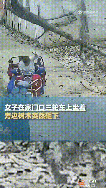安徽阜阳一名女子正坐在家门口停放的三轮车上时,突然旁边一棵大树的树枝掉了下来,直