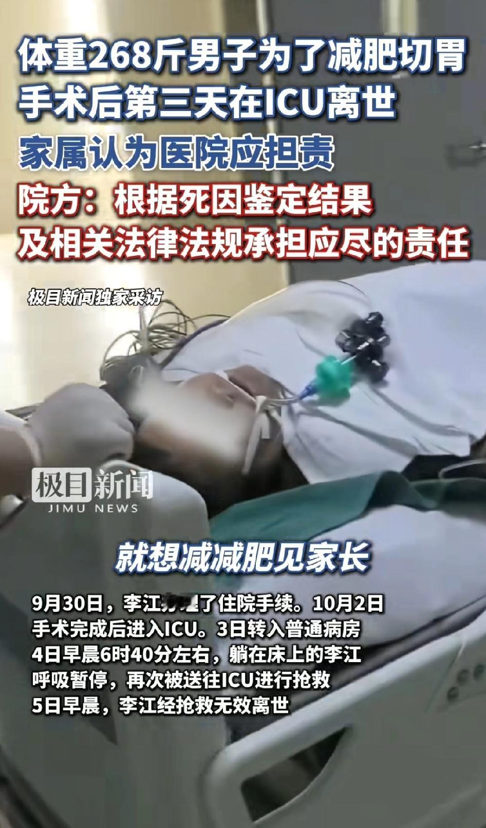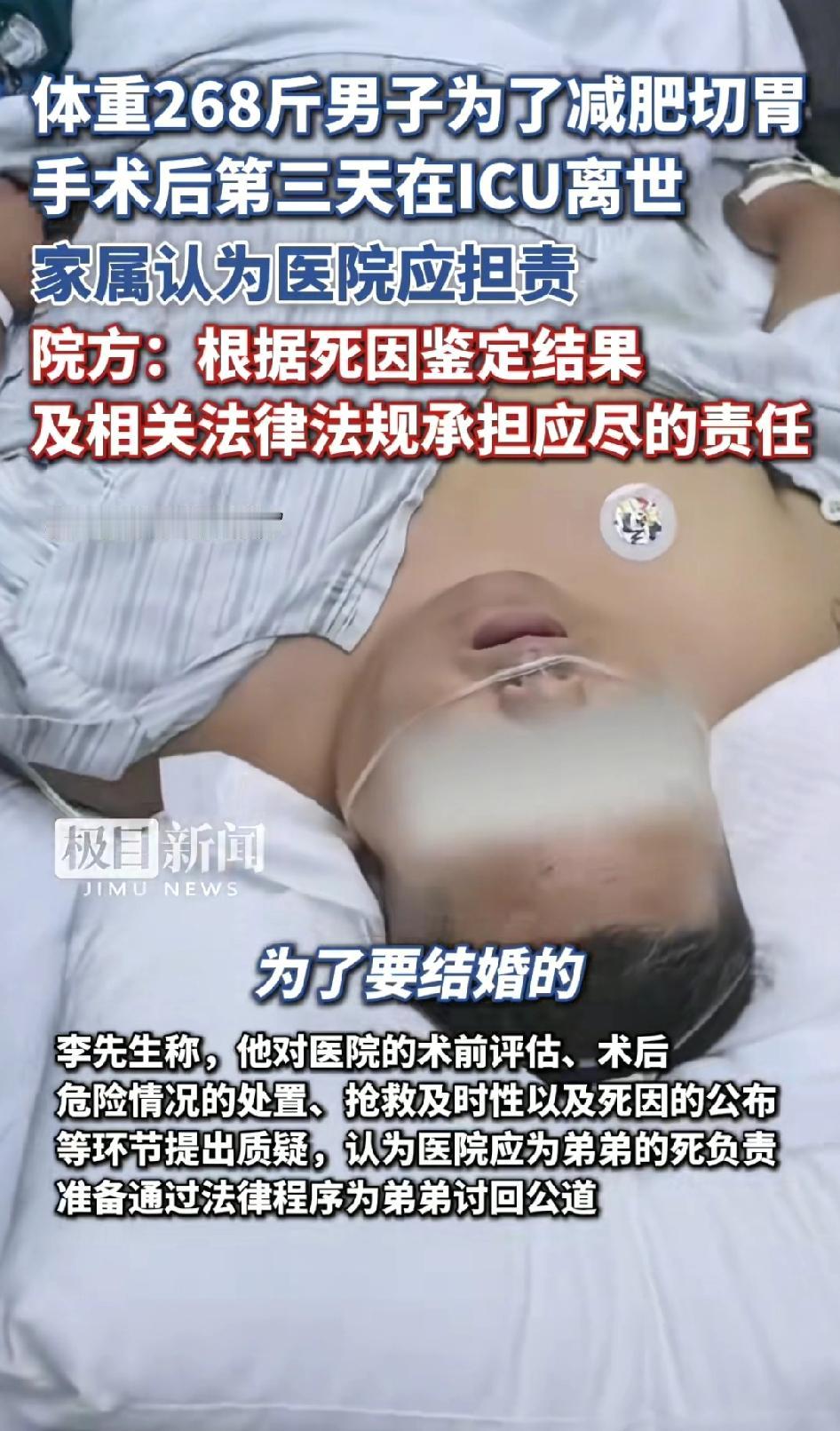 “太惋惜了!”一位体重268斤的男子为了见女方家长决定切胃减肥 ,结果手术后第三天在医院ICU去世 。 男子与女子相处不错,决定减肥改变一下形象,去见女方的父母 。他选择了切胃减肥的方式。于是到医院做切胃手术,令人没想到的是,男子没有挺住在手术后第三天在医院去世。院方会根据死因鉴定结果承担相应的责任 。 此事引起网友热议 ,现在有些医院的医生真敢下刀子啊? 我爱人220斤, 我们出去旅游爬山,他就受不了 。我就总规划旅游爬山, 也适当休息 ,他半年瘦了30斤了。 应该选择科学合理的方式 。少吃,多运动 ,配合着合理饮食 。为了健康,不要盲目减肥 。 对此你有什么看法 ?