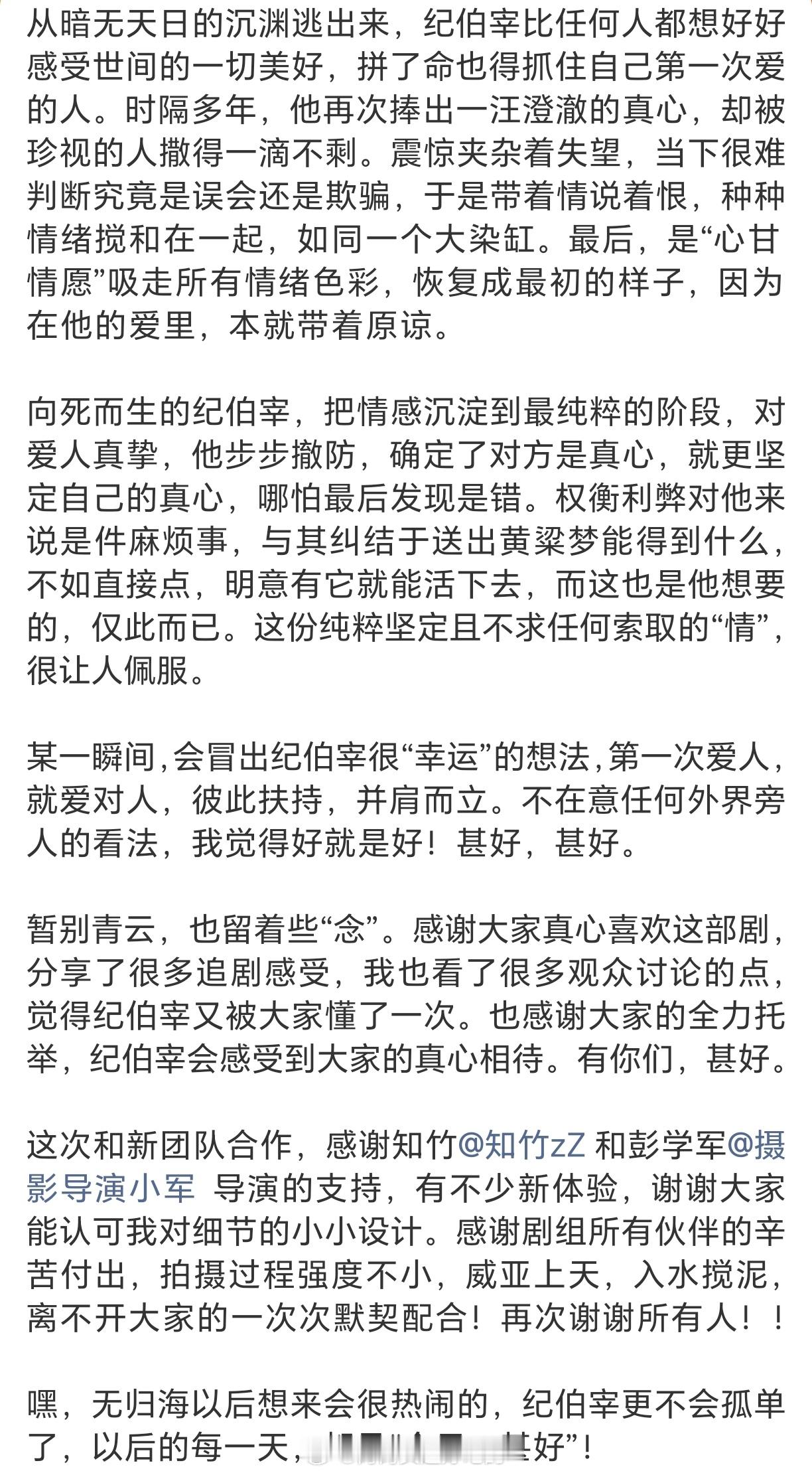 感谢了所有人,其实最值得感谢的是名号本人,把纪伯宰演绎的很好,成绩有目共睹。