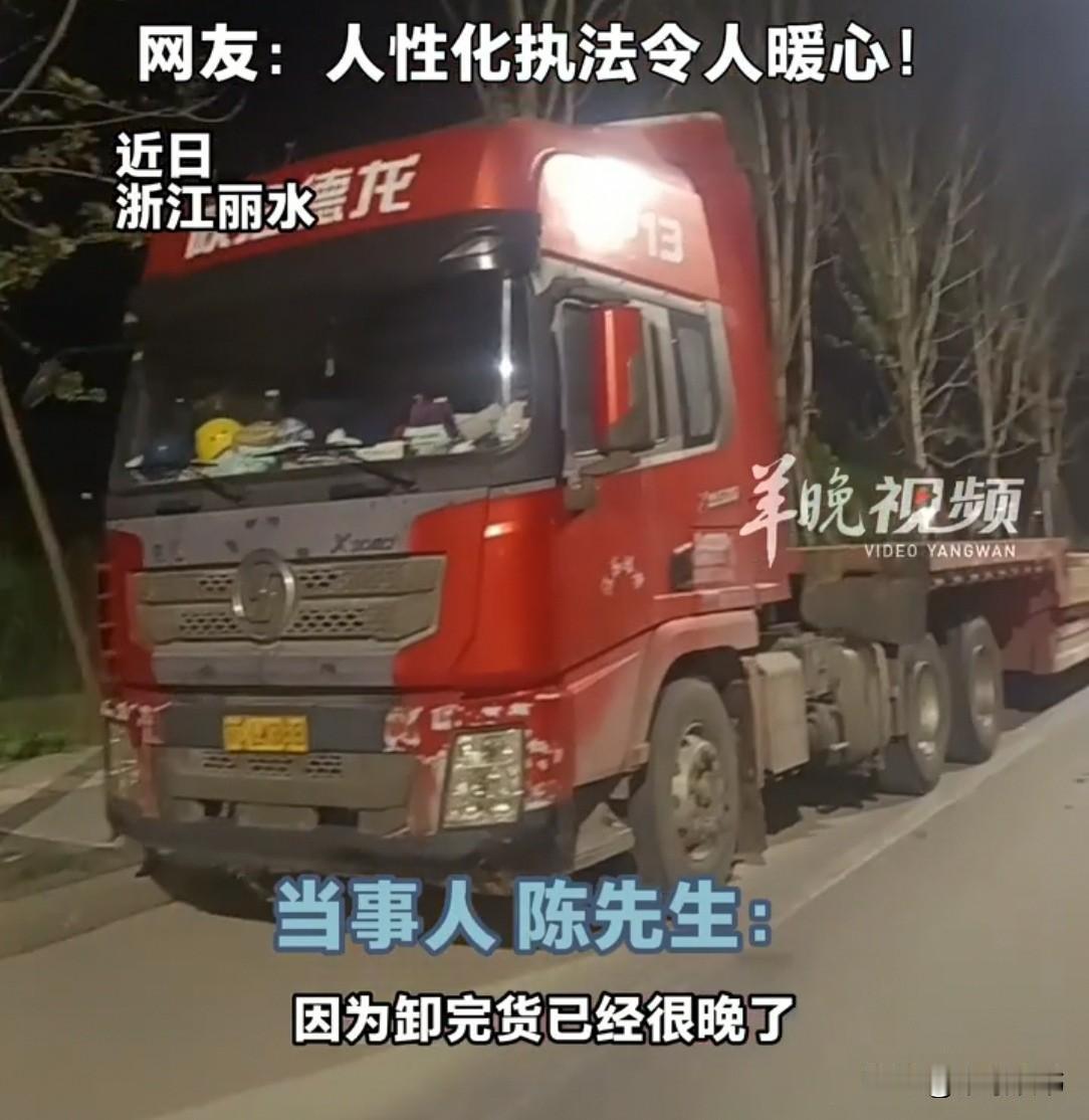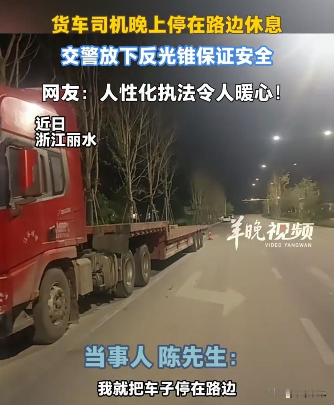 深夜,货车停在路边,师傅刚要歇脚,交警突然出现。他心头一紧,以为要罚款或驱离,不料,交警问清后,放下反光锥,轻声叮嘱“好好休息”。 浙江丽水一路边,一货车慢慢地开了过来, 司机陈师傅看了一眼周边,随后停了下来。 陈师傅来自江苏,这一趟车开下来,可把他累坏了。 陈师傅揉着僵硬的腰,把座椅往后调了调,刚要合上熬得通红的眼,车头前突然晃过一道荧光绿。 他心里“咯噔”一下,瞬间清醒过来,是巡逻交警来了。 陈师傅攥着方向盘的手不自觉紧了紧,指节泛白。 跑货运这十年,深夜路边停车从没讨过好,要么是被敲着车窗催着挪走,要么是递来一张罚款单,他甚至已经在脑子里过了一遍该怎么求情,才能少罚点。 荧光绿的身影走近,车窗被轻轻敲了两下,力度很轻,没像往常那样急促。 陈师傅深吸一口气,缓缓降下玻璃,一股带着凉意的夜风钻进来,他抬头,看见交警穿着反光背心,帽檐下的眼神很平和,没半点严肃的样子,开口声音也不冲:“师傅,这车是停在这儿过夜,还是待会儿要开走啊?” 陈师傅喉结动了动,犹豫了两秒还是说了实话,语气里带着点小心翼翼:“警官,我从江苏过来,拉了趟货到丽水,实在熬不住了,想着在这儿歇一晚上,天亮再走。” 说完他不敢抬头,盯着交警的鞋尖,心里七上八下的,就等那句“这里不能停,赶紧走”。 没成想,等了几秒,听见的却是交警的声音:“夜里歇脚也正常,就是你车后那两个锥桶,我刚才看了,没反光,夜里过往车看不见,太危险。” 说着,交警转身从巡逻车里拎出两个新的反光锥,又回头对他说:“我再给你两个,你那个旧的就别用了,不安全。” 陈师傅愣了愣,眼睛猛地睁大,下意识“啊”了一声,好半天才反应过来,连忙点头:“好的好的,谢谢您啊警官!” 他本来想推开车门自己去放,交警却摆了摆手:“你坐着歇着,我来就行,你跑长途累了。” 只见交警弯腰,先把陈师傅车后旧锥桶挪到路边,再把新锥桶稳稳放在货车前后两米远的位置,调整了两下角度,确保反光面正对着来车方向。 做完这一切,他拍了拍手上的灰,走到车窗边,轻声叮嘱:“夜里凉,把车窗留条缝就行,有事随时打路边的求助电话。” 看着交警转身走向巡逻车,车灯亮起又缓缓驶远,陈师傅还坐在座位上没回过神。 他望着车后那两个亮闪闪的反光锥,夜里过往的车灯扫过,锥桶上的荧光格外醒目,心里像被什么暖烘烘的东西填着,眼眶忽然有点发热。 跑了这么多地方,这还是头一次,交警没罚他、没赶他,还特意给了新锥桶,嘱咐他好好休息。 陈师傅搓了搓手,重新调了调座椅,这一次,他睡得格外安心。 一句“好好休息”,两个反光锥,暖了跑路人的心。 老话说“良言一句三冬暖”,执法的温度比罚单更让人记住。规矩是硬的,但人心是软的,这份体谅最珍贵。