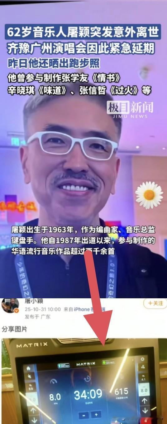 跑步机上的生命骤停! 62岁音乐大师离世 给所有人敲响警钟 今天刷到屠颖老师离世的消息,心里咯噔一下,太突然了!这位打造过《过火》《味道》等无数经典编曲的音乐巨匠,竟然因为在酒店跑步机上摔跤,头部撞击地面导致颅内出血离世 。更让人唏嘘的是,出事当天早上他还分享了跑步机运动的照片,平时更是风雨无阻坚持运动的人。 很多人觉得运动就是健康的代名词,但忽略了风险其实藏在细节里。屠颖老师用一生给华语乐坛留下两千多首作品,林俊杰、杨丞琳都在悼念他的付出,可这样一位热爱生活的大师,却栽在了日常运动的意外上。这真不是说运动不好,而是提醒我们,不管做什么运动,安全永远要放在第一位,尤其是中老年人,运动时千万不能掉以轻心。 刘德华和王家卫有什么恩怨吗 孙颖莎未来能成女乒一姐吗? 如何看待石家庄妻子撞死家暴丈夫案 高市早苗的媚美行为会带来哪些后果 《沉默的荣耀》会成为谍战剧天花板吗 明星私生活应该被曝光吗 王家卫的电影对香港电影业有何影响 你觉得孙颖莎漂亮吗 你看过冯淬帆哪些作品