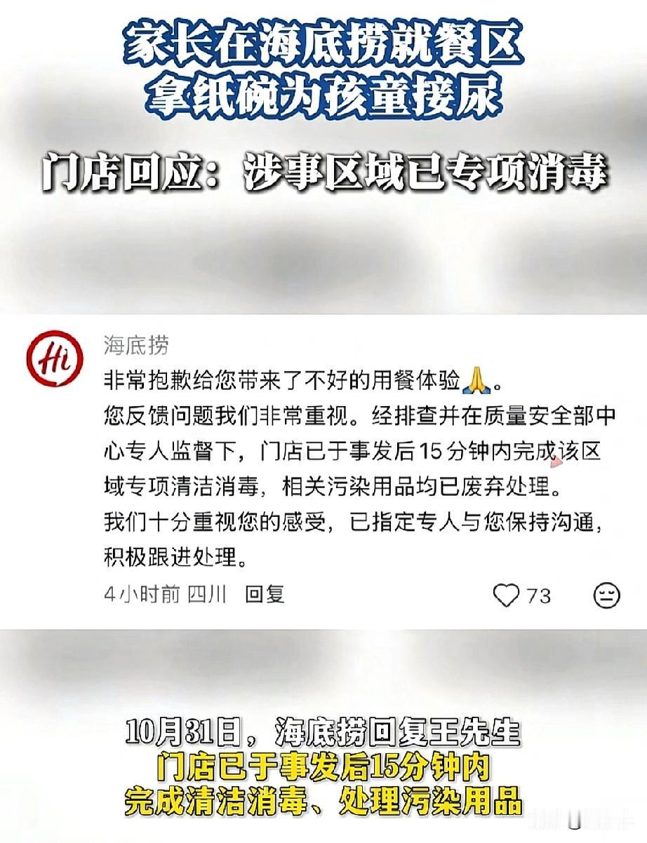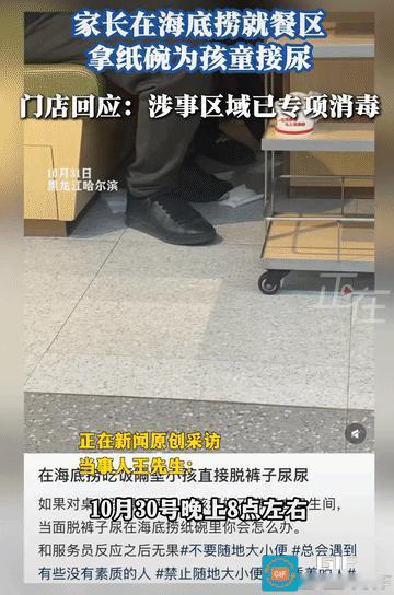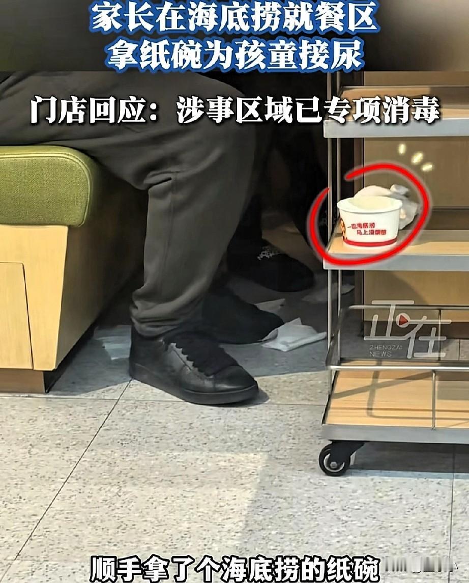 大千世界,无奇不有!黑龙江一位家长在海底捞就餐区,拿纸碗给孩子接尿,随后接尿纸碗放在备菜的推篮上,周边都是尿味,还用擦手毛巾擦拭。难道前段时间的220万赔偿,也没让家长们记住吗? 王先生在海底捞吃饭时,旁边一位女子带着孩子,孩子想要尿尿,女子直接就拿着纸碗接尿,因为在王先生的对桌,孩子的屁股正好对着王先生 完事后这位女子并没有扔出去,反而直接就把这个接尿的纸碗放在备菜的推篮上,还用擦手毛巾擦拭。 也是这位女子的做法,导致了周边都是尿骚味,王先生也实在是吃不下去了,就向工作人员反映,工作人人员赔偿他一份果盘,但王先生并没有接受也没有吃。 对此,门店也在事发后15分钟内完成专项清洁消毒,更换所有污染用品,并由质量安全部监督执行。 此事引发热议!有的网友表示,海底捞都是有厕所的 就几步路, 拉在垃圾桶我都能理解 ,你还把它放在备菜栏,这家长是不是有点那啥了。 有网友表示,在门口摆个显眼的立牌,禁止随地大小便,违反者不论年龄,一律罚款。 其实, 带孩子的都知道,害怕小孩憋不住用来应急可以理解,因为小孩憋不住尿,但是接完以后,作为家长赶紧拿去厕所丢了才是更加正确的吧,毕竟是就餐环境,谁都不希望自己吃饭的地方,旁边就放着排泄物嘛,更何况还用毛巾擦屁股,还放在菜篮上。 这样的奇葩人,让人难以理解!