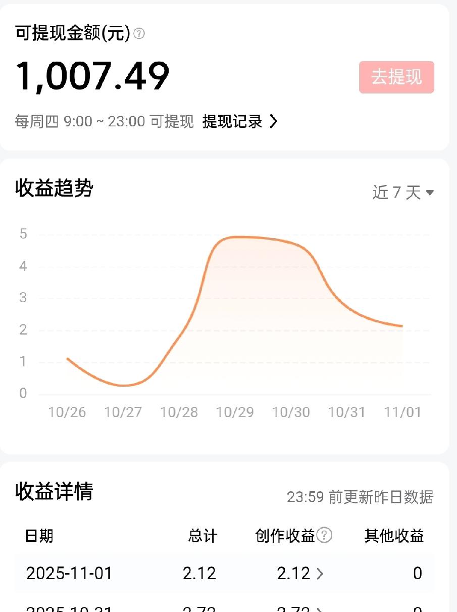 这是在头条中挣的第一个1000块,但是在星期四的时候没有舍得提现。 自从政策改变之后,想要再挣第二个1000块,可没有那么简单了,之前还能几十几十的,可是现在每天只有几块钱。 星期四的时候,女儿说,妈妈,你怎么没有提现啊?我说真的舍不得。下一个1000块钱就需要几块几块的攒了,不知道啥时候能攒够,先把它放在这里面几天吧。