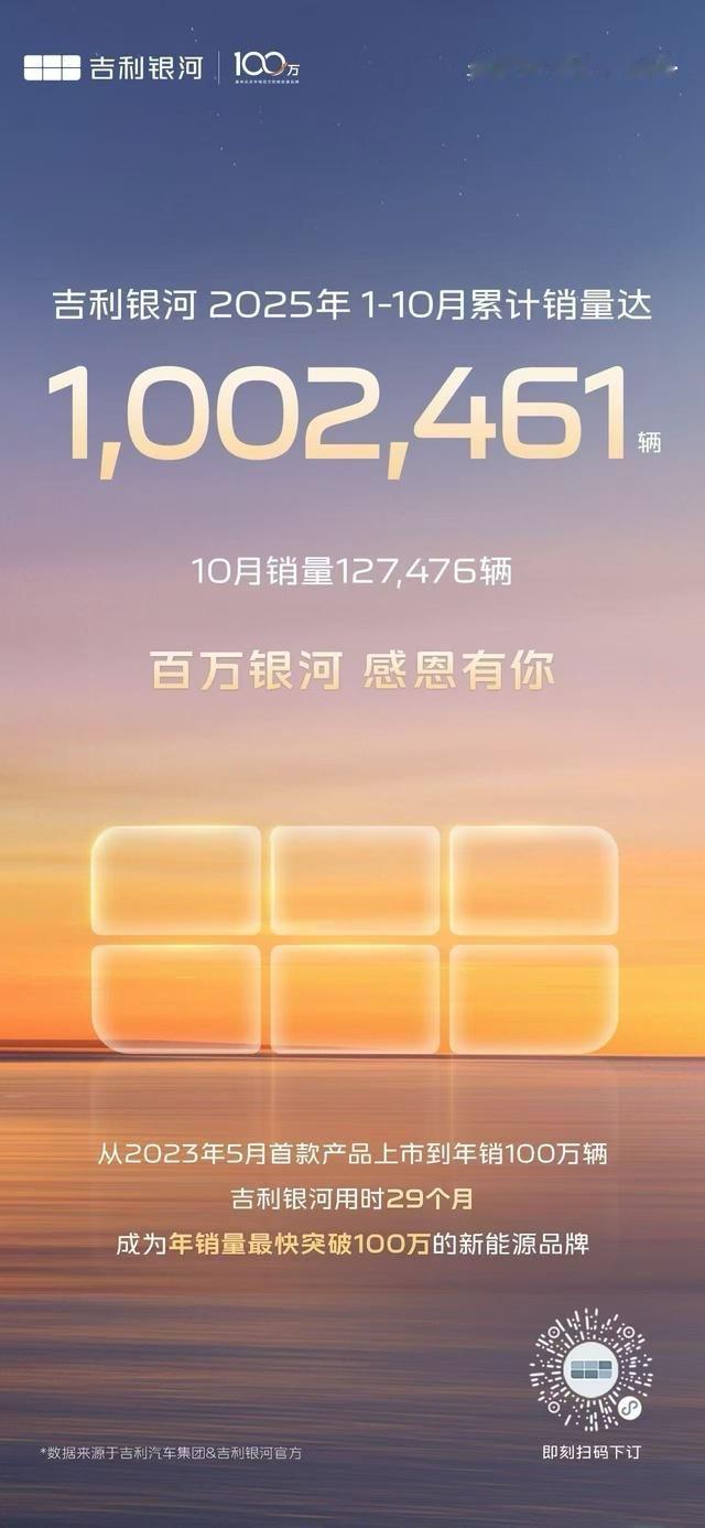 吉利银河应该算是和比亚迪一样的传统里的新能源品牌企业吧,如果这么算的话,比亚迪的元朝时代应该才是首先过百万的新能源汽车品牌? 不过也应该祝贺吉利银河,过去的一年真心不易,其实真正的打造爆款并不容易,几何并入吉利银河网络,银河诞生银河e系列和星耀系列,然后快速在月销量榜单上榜,说明银河走的没错