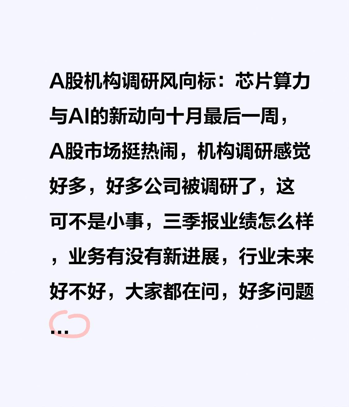 A股机构调研风向标:芯片算力与AI的新动向 十月最后一周,A股市场挺热闹,机构调研感觉好多,好多公司被调研了,这可不是小事,三季报业绩怎么样,业务有没有新进展,行业未来好不好,大家都在问,好多问题要搞清楚,市场也跟着动起来了。 被调研的公司,六成股票涨了,有些公司表现特好,很亮眼,兆易创新,这个名字记住了,芯片龙头,千亿市值,机构都盯着它,276家机构去了,厉害,三季度营收,净利润都增长了,不容易,NOR Flash,中小容量产品涨价,全年估计也会涨,DRAM呢,一直缺货,明年估计也涨,产能还是不够,明年DRAM可能好点,稳中有升吧。 金盘科技,名字也记住,全球电力设备供应商,254家机构调研,看来也有料,三季度营收,净利润也增长,AI算力中心,是增长点,AIDC业务,今年前三季度增长不少,海外市场呢,变压器紧张,数字化转型,提升竞争力,这个可以有。 蓝思科技,开始转型了,做机器人,这家公司不简单,226家机构调研,也有人关注,三季度营收,净利润也有增长,机器人业务,进入北美和国内头部供应链,人形机器人,四足机器狗,出货量还可以,四季度呢,估计会更好,全年高质量增长,跟北美客户合作,拓展AI服务器,这条路子可以试试。 恺英网络,游戏公司,199家机构,三季度营收,净利润增长,传奇盒子及其品牌专区,收入贡献大,这个要知道,IP运营,资源整合,传奇IP,市场声量提高,短剧业务,多部短剧上线,看来也在尝试新东西,很多人看完这个故事,都会去想,下一个风口在哪里,大家都在想,这到底是怎么一回事,谁也没法给出确定答案,只能走一步看一步了。芯片股行情 AI算力板块 AI 行业分析