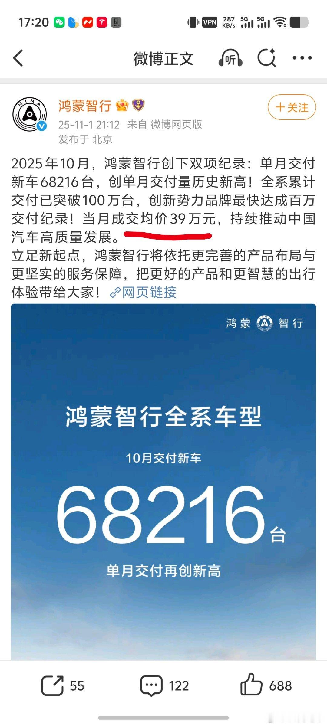鸿蒙智行10月平均成交价39万[震惊][震惊]