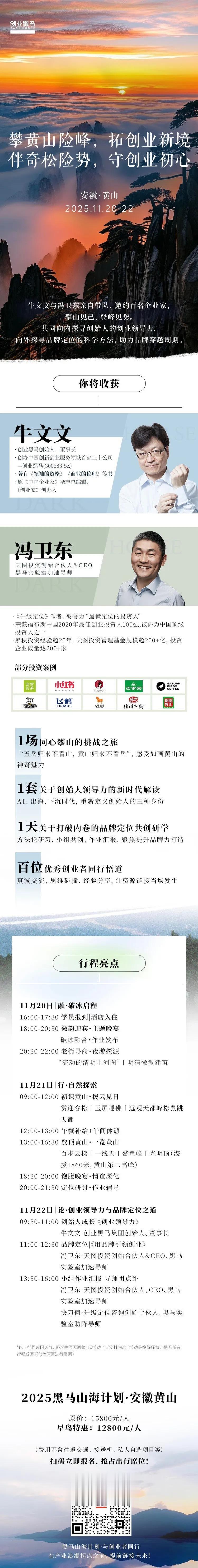 报名「黑马·山海计划班」,11月20日-22日,天图投资创始合伙人&CEO冯卫东将与创业黑马董事长牛文文,亲自带一批黑马的同学们,一起走进安徽黄山。