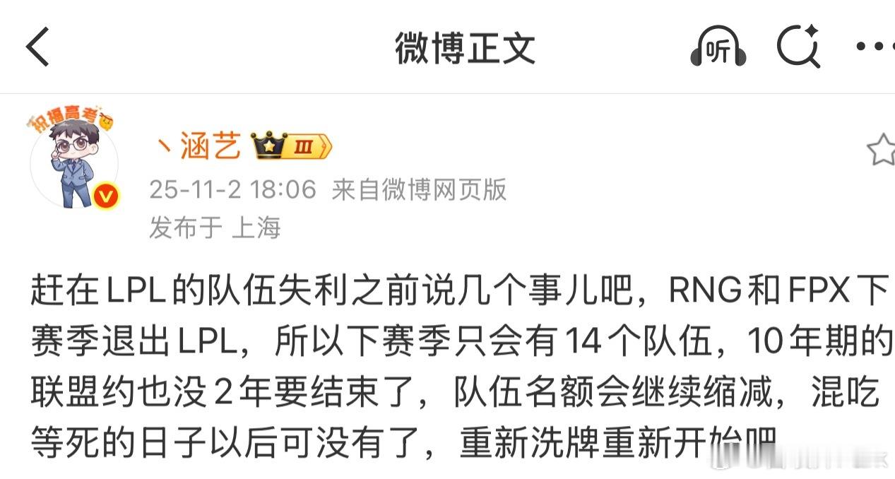 涵艺爆料RNG和FPX退出LPL涵艺爆料明年只有14支LPL队伍t1对战tes ​​​