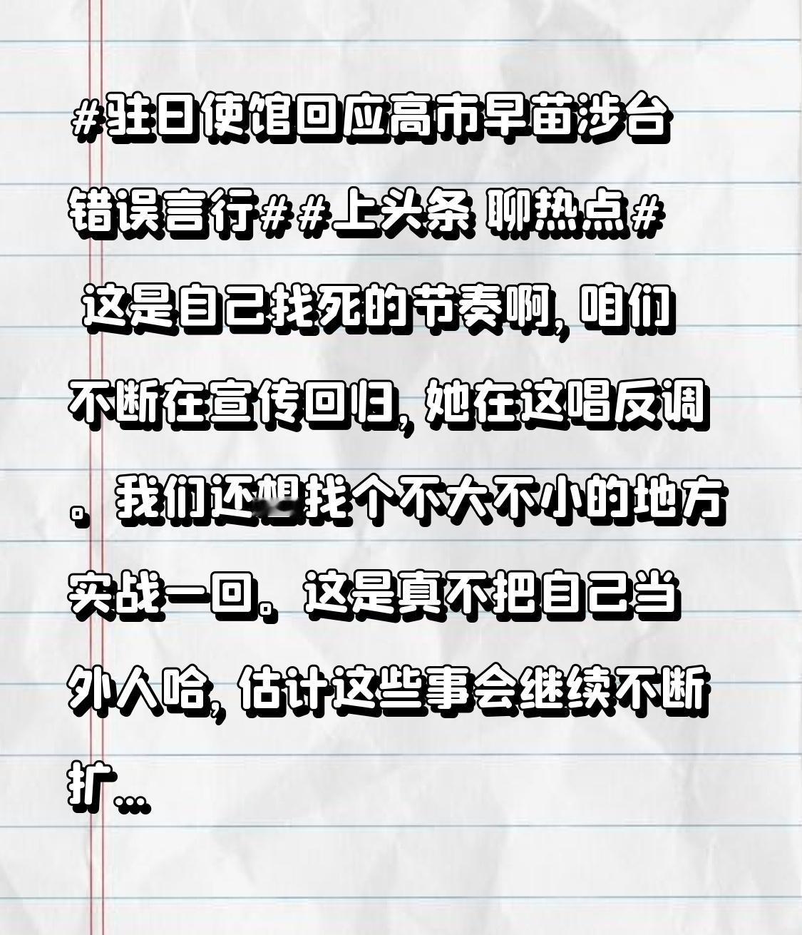 这是自己找死的节奏啊,咱们不断在宣传回归,她在这唱反调。我们还想找个不大不小的地方实战一回。这是真不把自己当外人哈,估计这些事会继续不断扩散发酵。这次只是为了出手前的准备之一,希望你继续得瑟。要不国仇家恨何时报。