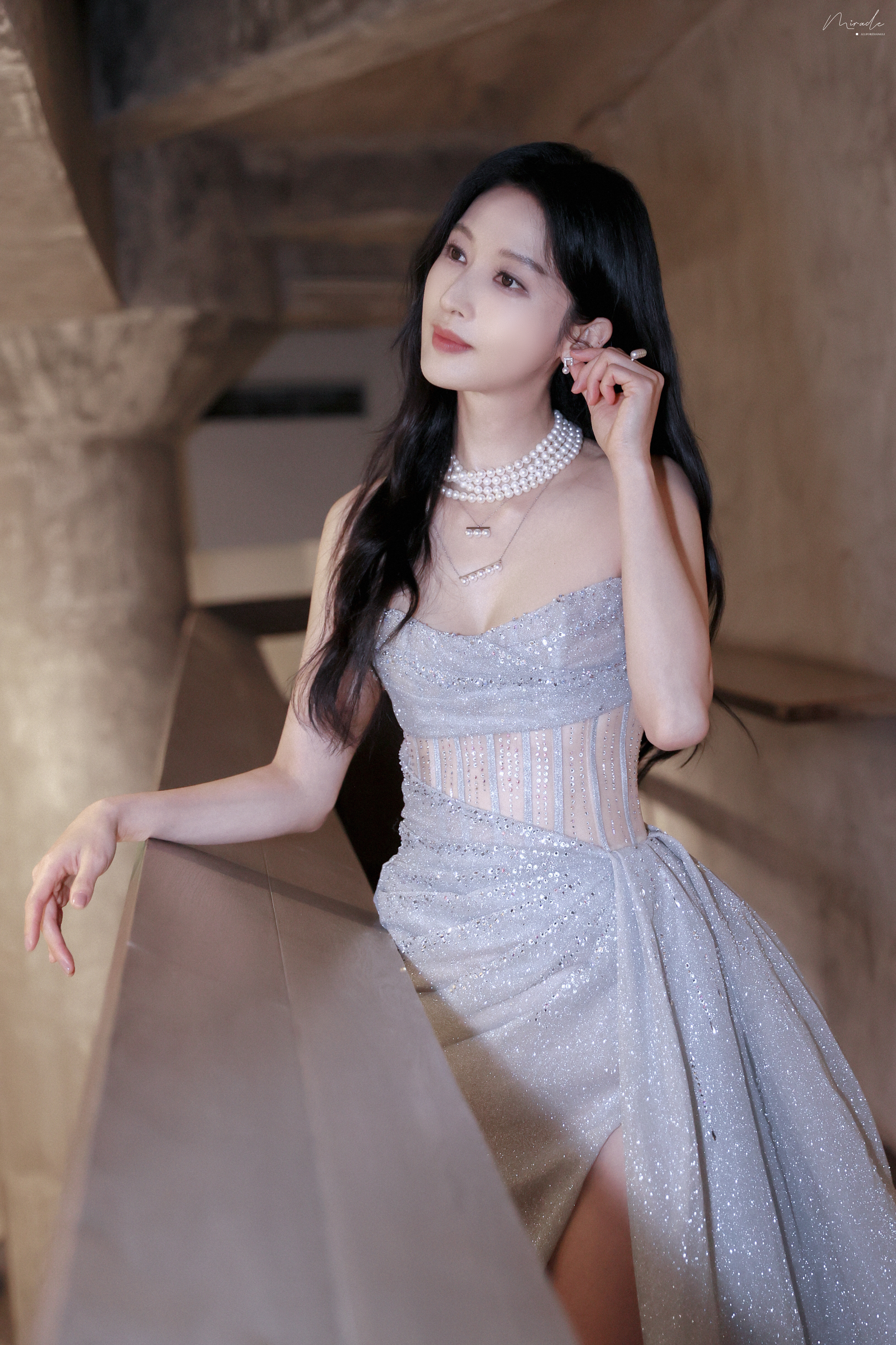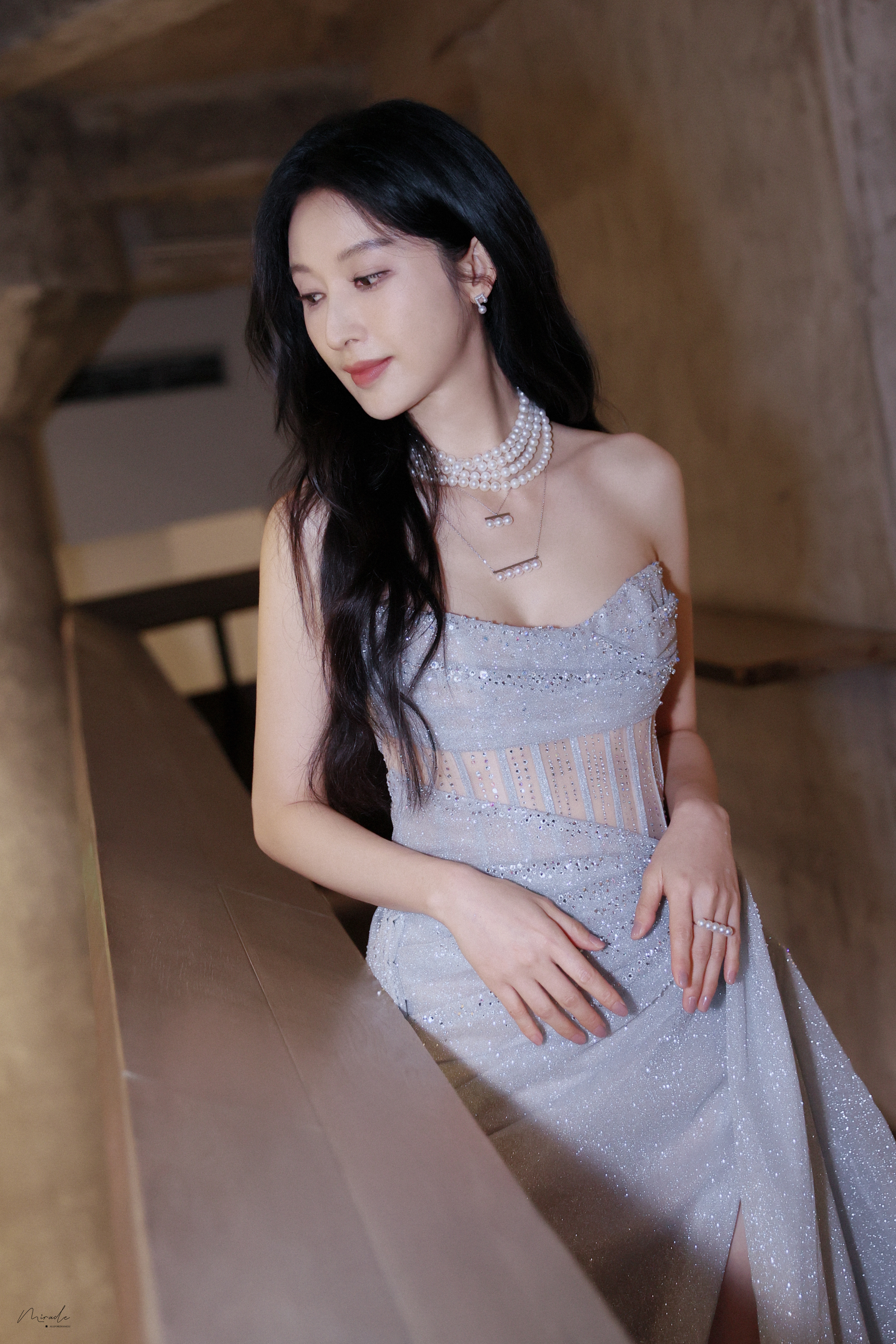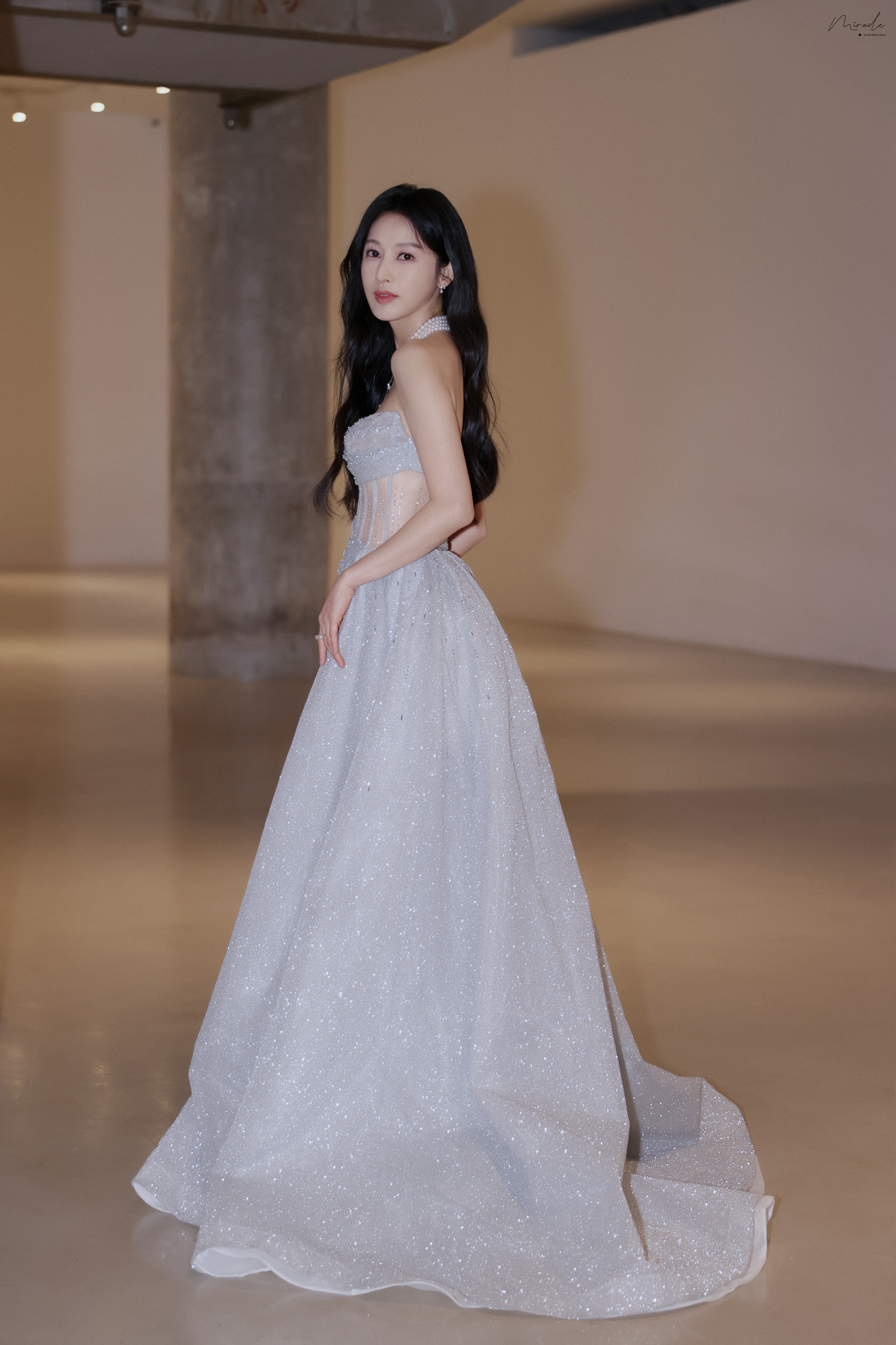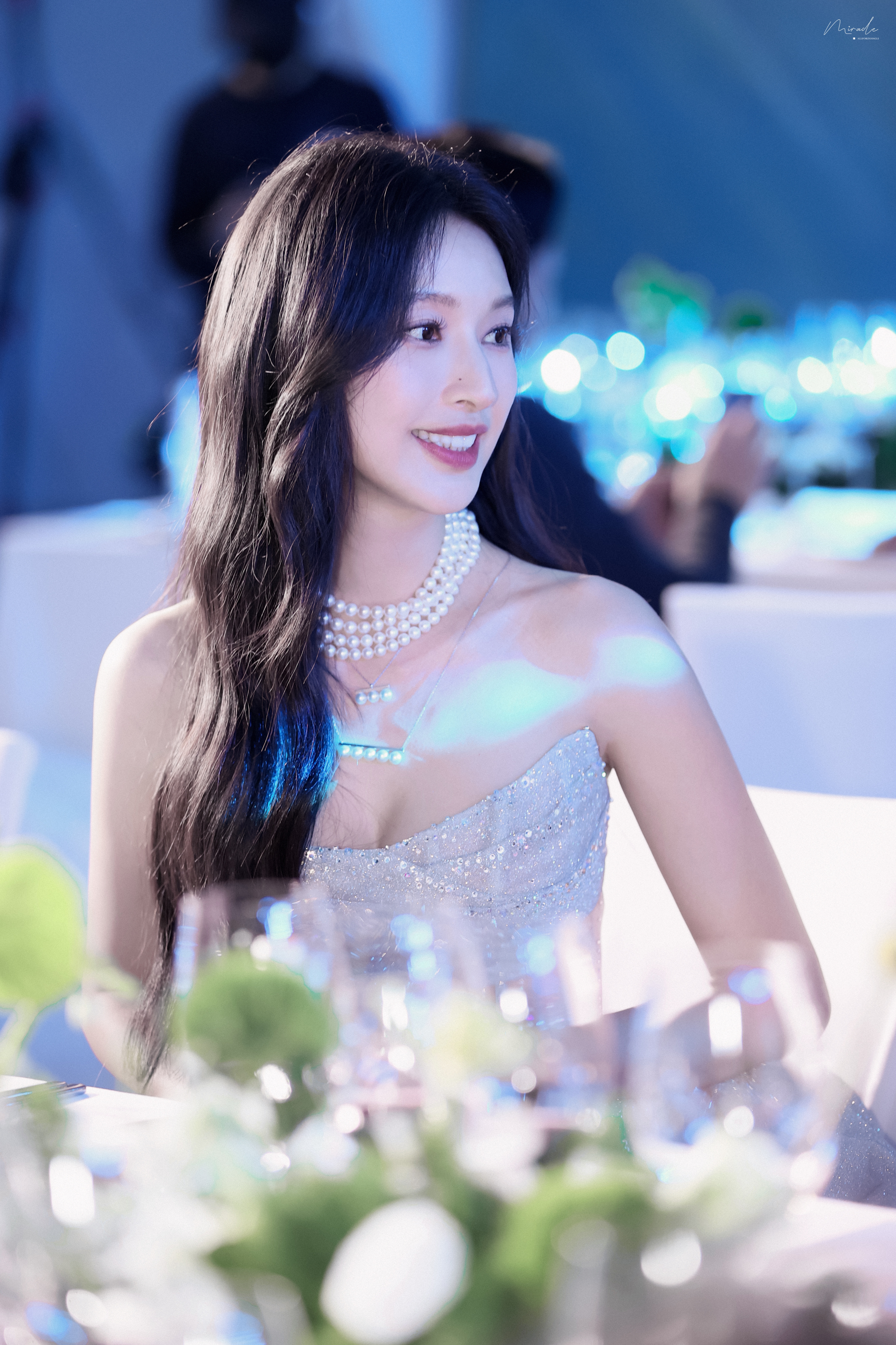 张俪 抹胸设计勾勒精致肩颈,高开叉裙摆尽展飒爽风姿,珍珠与碎光交辉,每一处细节都在诉说着从容与璀璨。2023.12.23