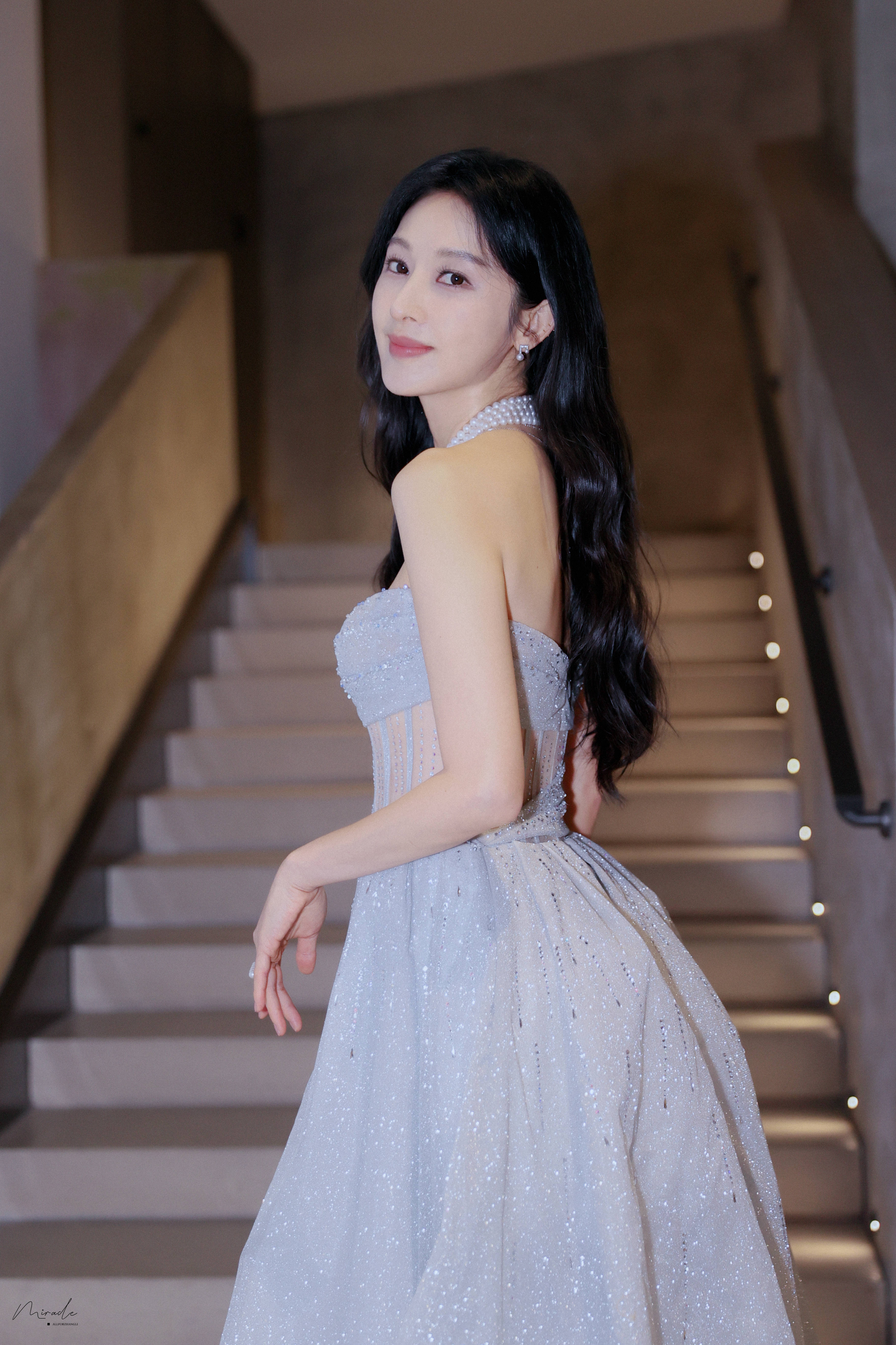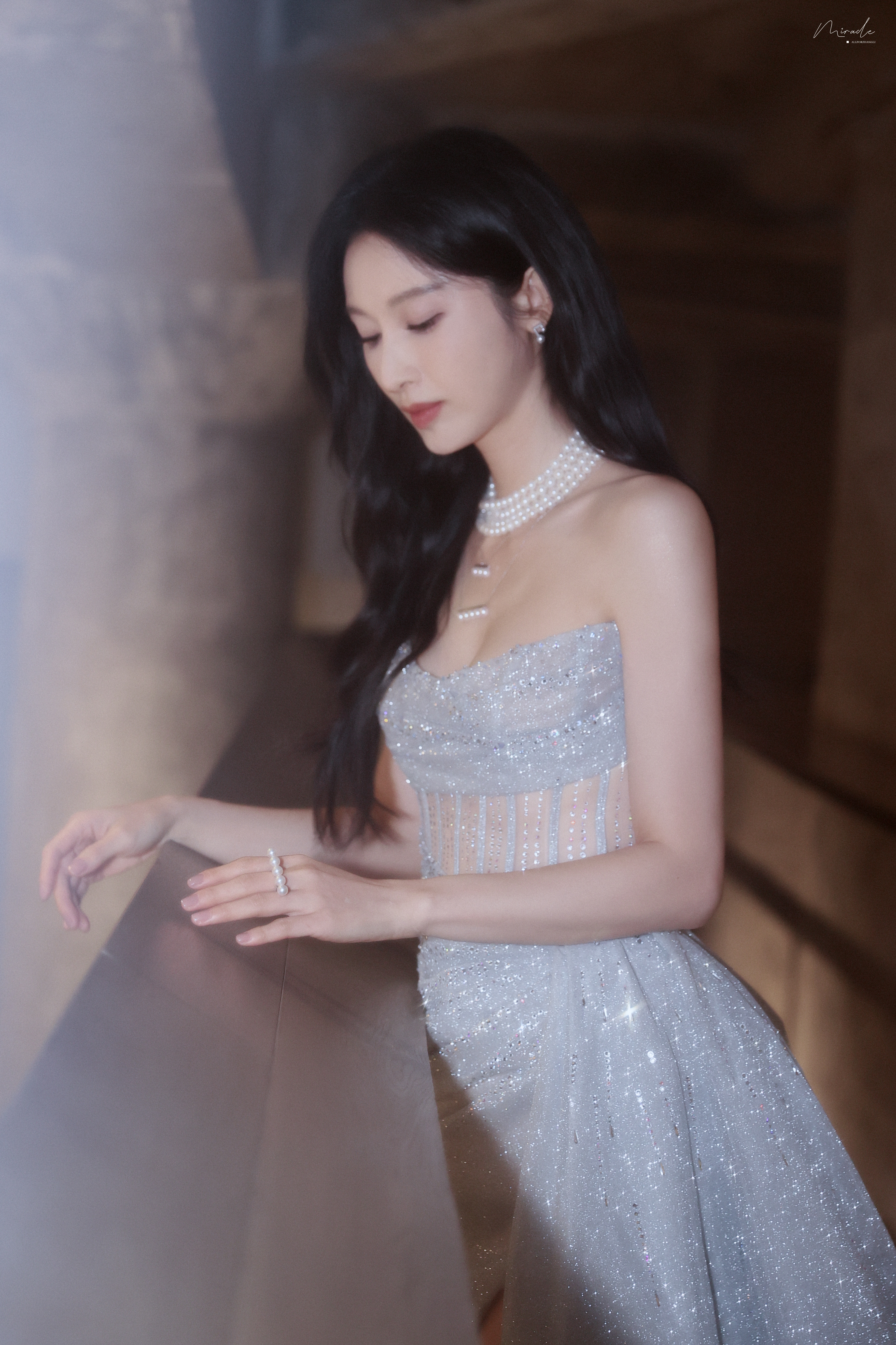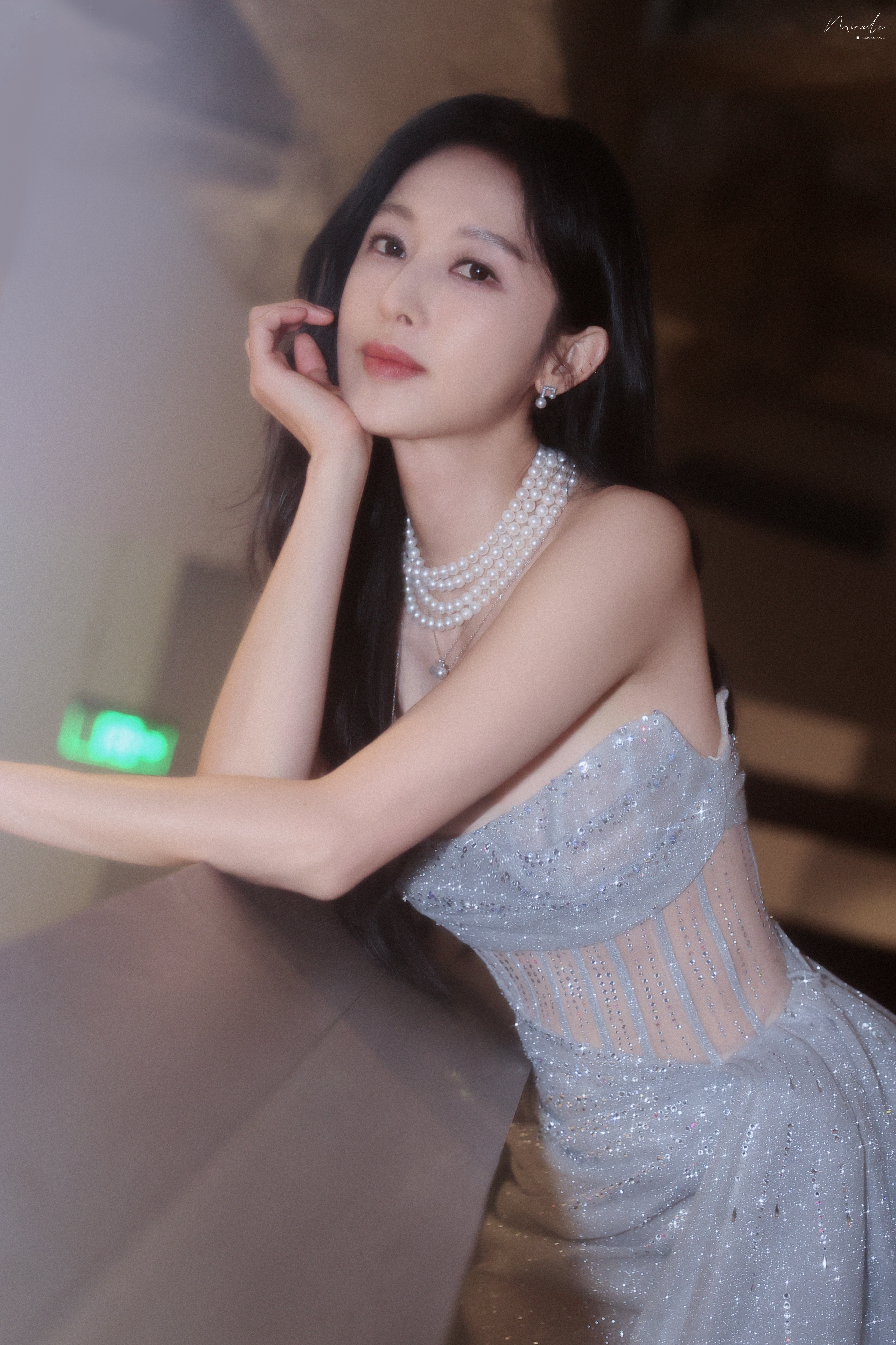 张俪 抹胸设计勾勒精致肩颈,高开叉裙摆尽展飒爽风姿,珍珠与碎光交辉,每一处细节都在诉说着从容与璀璨。2023.12.23