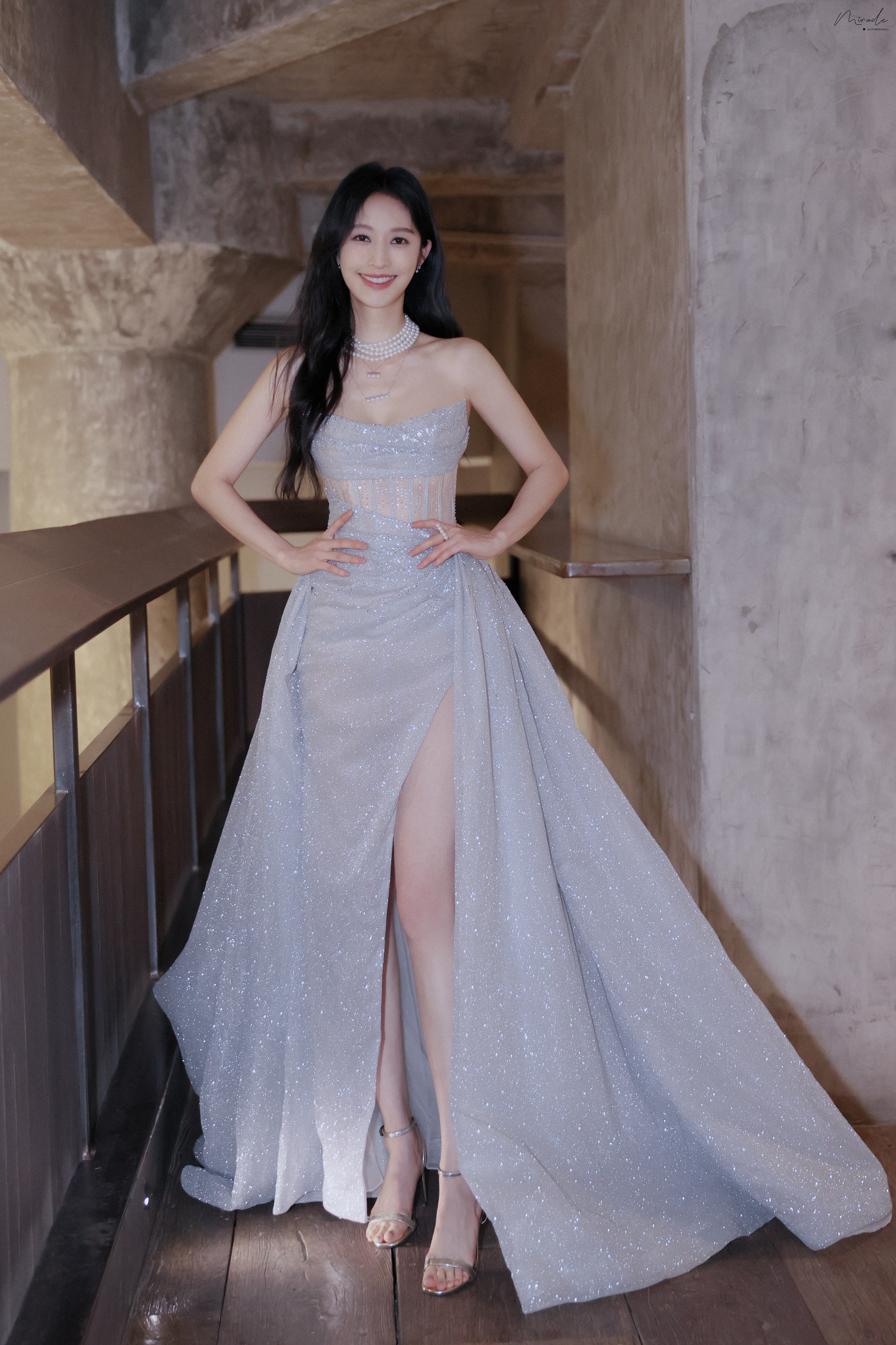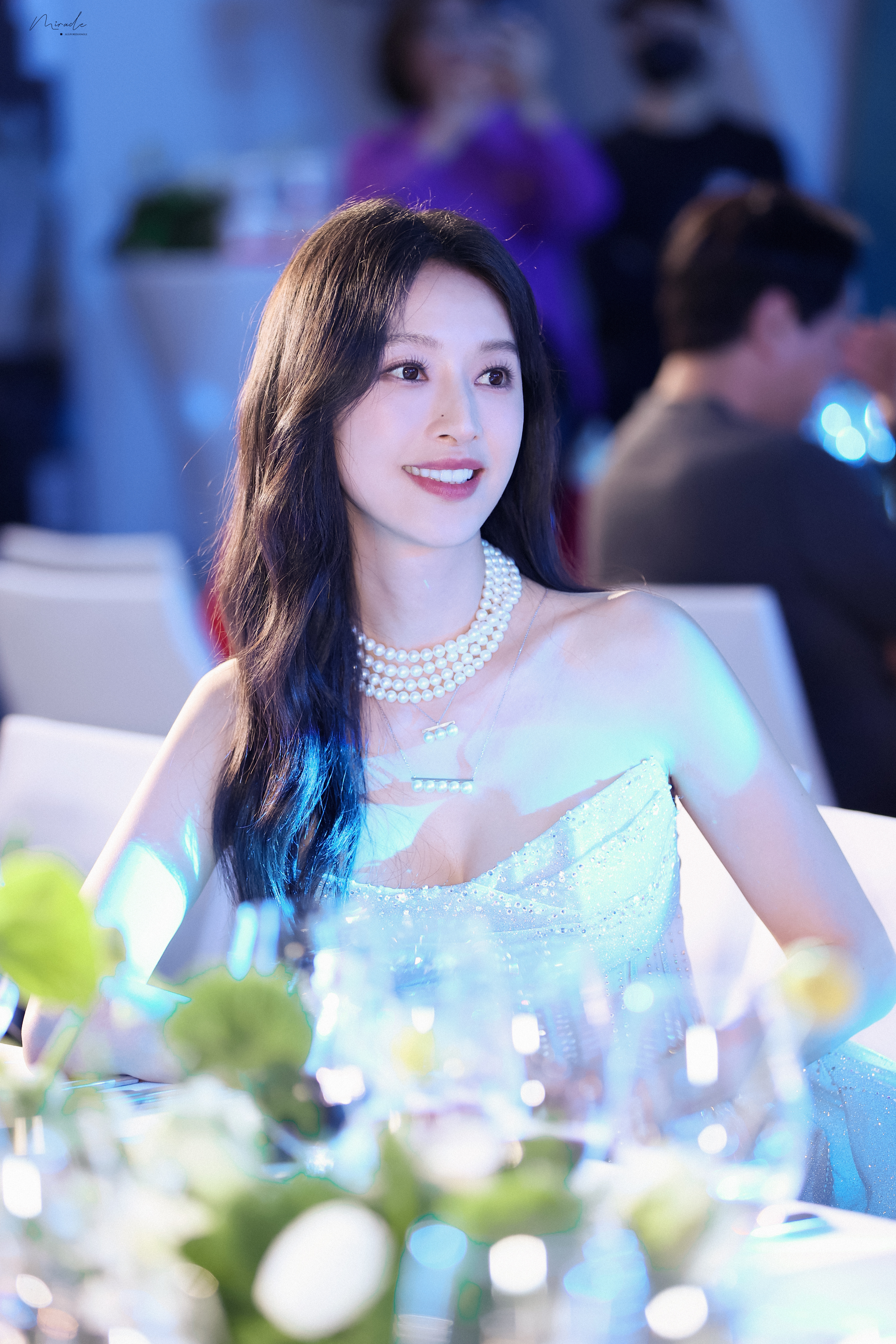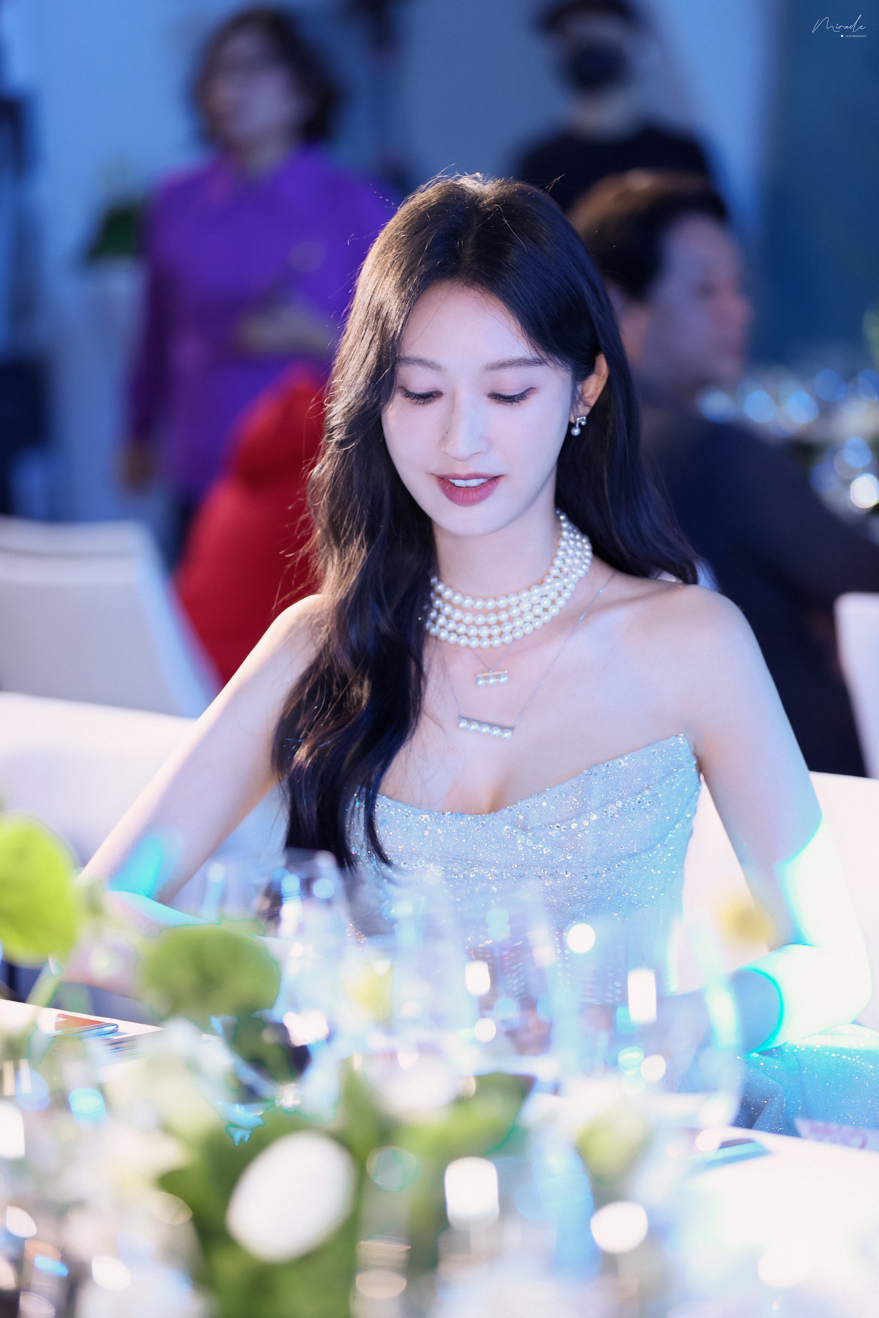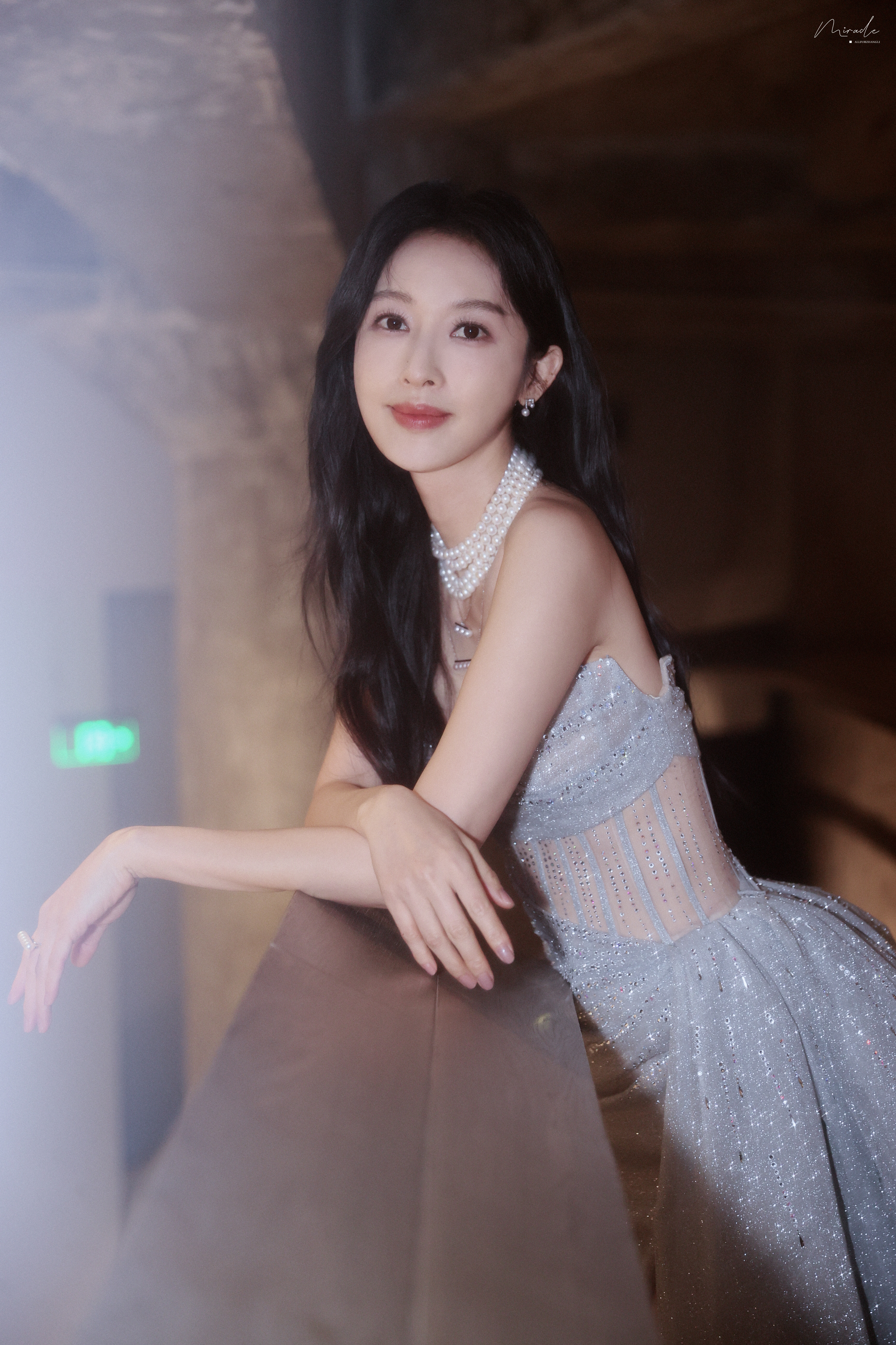 张俪 抹胸设计勾勒精致肩颈,高开叉裙摆尽展飒爽风姿,珍珠与碎光交辉,每一处细节都在诉说着从容与璀璨。2023.12.23