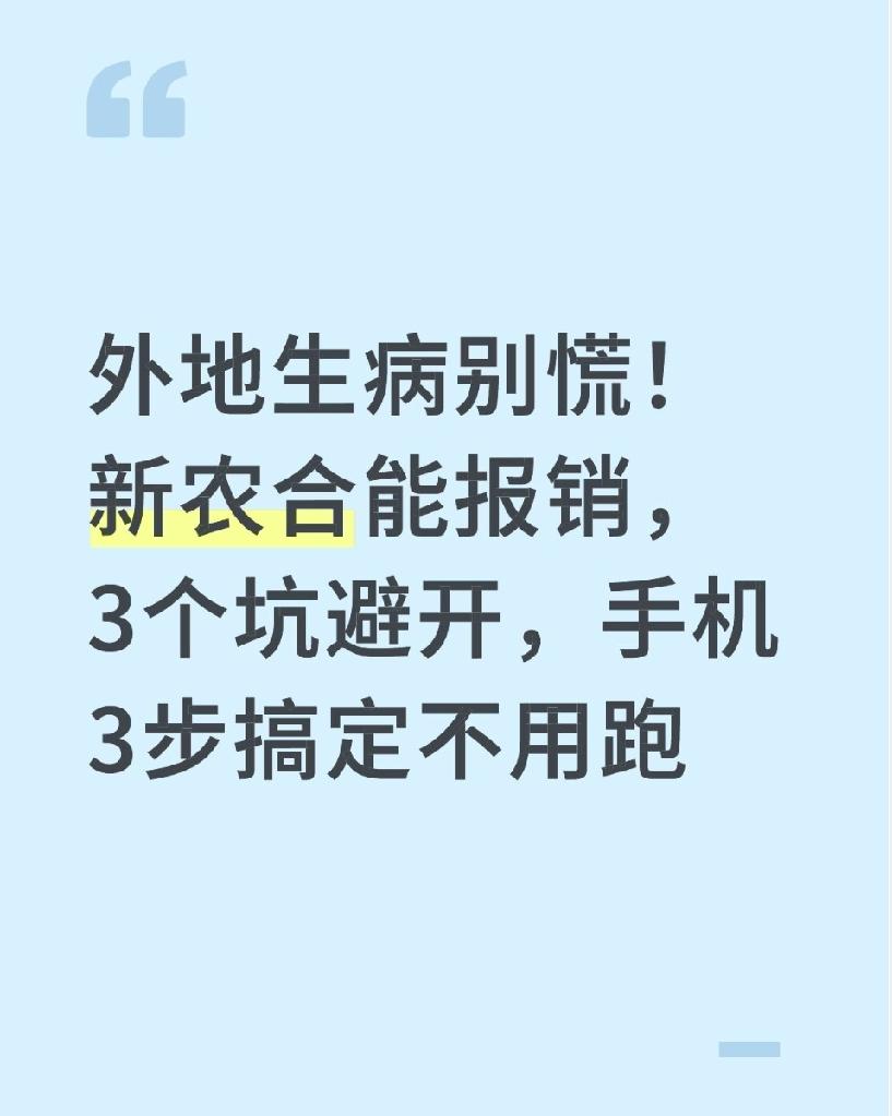 外地生病别慌!新农合能报销,3个坑避开,手机3步搞定不用跑 在外地打工突然生病,老家交的新农合到底能不能报销?不少人都有过这种纠结:不看病怕耽误病情,看病又担心报销手续太麻烦,最后花的钱全打了水漂。其实2025年的新农合异地报销早不是“老大难”,但得踩准节奏找对方法,不然很容易白花钱、多跑腿。 先给大家吃颗定心丸:新农合异地就医能报销,不管是省内跨市还是跨省看病都能报,但有个前提——得提前办备案。去年王婶帮上海住院的儿媳报销的经历就很典型,她前前后后跑了3趟医保站,才摸清这里面的门道,咱们正好借她的经历避避坑。 第一个必须避开的是“备案时机坑”,早3天办能省几千垫付钱。王婶儿媳住院前没备案,先交的5000元押金只能自己全额垫付,后来才知道住院前3天内办备案,就能直接刷社保卡结算,不用掏这笔“冤枉钱”。这里分两种情况:要是从老家医院转去外地看病,得拿好转诊证明;要是突发急病来不及转诊,像心梗、难产这些,凭医院的急诊病历就能办“急诊备案”,不用回老家开证明。 有人说“我不会用智能手机,没法办备案”?现在渠道多的是,根本不用愁。最方便的是“国家医保服务平台”APP,3步就能搞定:下载登录后点“异地就医备案”,选“异地住院备案”,填好参保地和就医地,上传急诊病历或转诊证明,当天就能通过审核。不会操作的话,让家里年轻人帮忙代办,或者打社保卡背面的医保电话备案也行,实在不行去当地医保站现场办,工作人员都会帮忙。 但备案时得看清楚“就医地类型”,别把“住院备案”选成“门诊备案”,不然住院费用一分都报不了。而且备案有效期一般是6个月,要是住院时间长,得提前续期,超过有效期就没法报销了。还有个特殊情况:省内短期看病大多不用备案,但低保、特困这些特殊人群必须办,不然会影响报销比例。 第二个坑是“报销比例坑”,医院等级不同差不少钱。很多人以为异地报销比例都一样,其实差得远。比如在外地社区医院(一级医院)住院,报销比例能到80%;县级医院(二级医院)70%;市级以上大医院(三级医院)60%,比在老家看病的比例低10%-15%。要是没备案,比例还要再降20%,原本能报60%的直接砍到40%,花10万就能少报2万。 不过特殊人群有额外福利:低保户、特困人员异地住院,起付线能减半,报销比例还能再提高5%-10%。安徽的李业泉大爷就是例子,他是建档立卡贫困户,在省内异地住院总费用13.5万,最后个人只花了2000多,报销比例高达97%。这里提醒一句,市外医疗机构的起付线一般是1000元,比市内三级医院的700元高一点,报销时会先扣掉这笔钱再算比例。 第三个坑是“资料准备坑”,少一样都报不了。王婶第一次去报销就吃了亏,少了住院费用总清单和出院小结,白跑一趟。后来她带齐了5样东西才办成:身份证复印件、社保卡复印件、住院发票、费用总清单、出院小结,15个工作日内报销款就打到了社保卡的金融账户里。 要是没办成直接结算,出院后手工报销得抓紧时间,原则上要在费用发生次年6月底前办好,逾期可能就报不了了。还有人问进口药能不能报?关键看是不是在“医保目录”里,在目录内的就能按比例报,不在的就只能自费,不确定的话可以在国家医保服务平台APP上查。 现在全国大部分定点医院都能跨省直接结算,安徽甚至实现了省、市、县、乡、村五级医疗机构联网,29岁的沈俊在山东做肾脏移植,26.3万的费用当场就报了11.6万,不用自己垫全款。这说明新农合异地报销早就不是“纸上政策”,关键是把备案、选医院、备资料这三步走对。 最后想问问大家,你们异地看病时遇到过报销难题吗?是备案出了岔子,还是资料没备齐?要是分不清哪些药能报、哪些不能报,或者不知道怎么查异地定点医院,都可以在评论区留言,咱们一起找解决办法。乡村医保缴费 新农合政策
