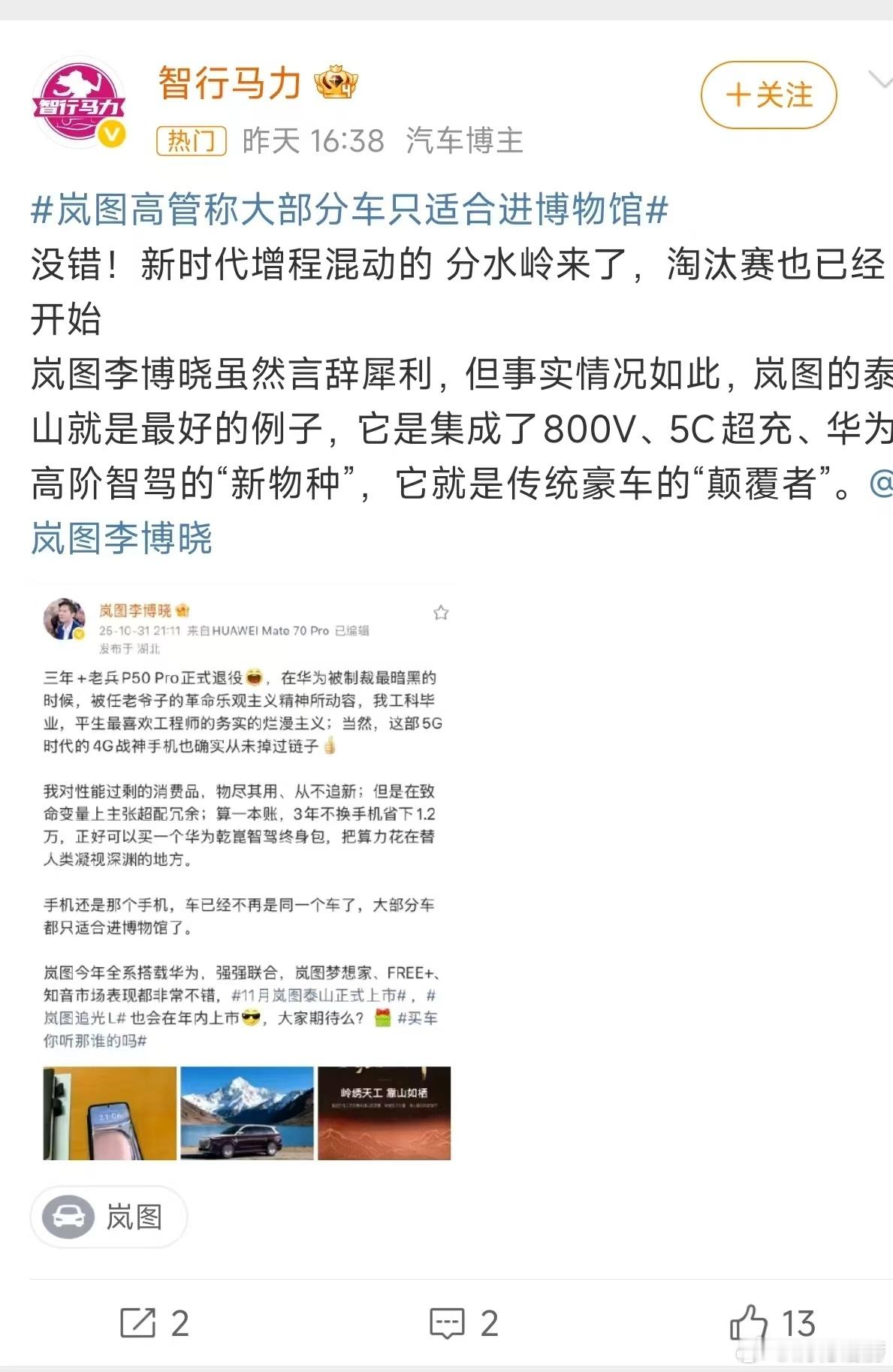 岚图高管的这段话可以说是给旧时代的汽车工业敲响了警钟。随着智能时代的到来,以即将上市的岚图泰山为代表的新一代智能车,凭借800V架构、5C超充以及华为高阶智驾等先进的智能技术,与传统车型形成了鲜明的代际差异。如果不能跟上智能化的步伐,被淘汰的命运将不可避免。用'进博物馆'来形容这种状态,确实非常形象。