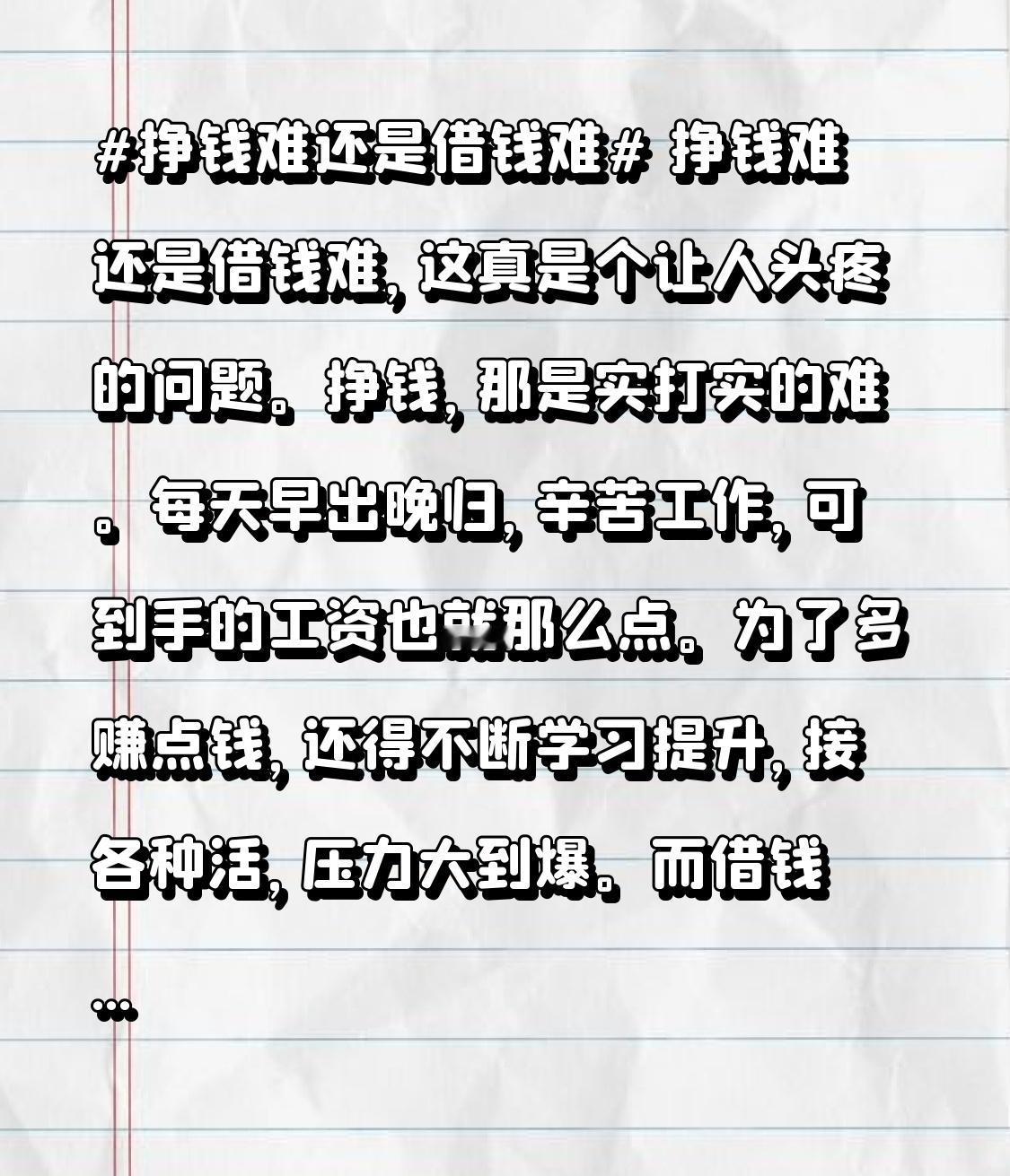 挣钱难还是借钱难,这真是个让人头疼的问题。挣钱,那是实打实的难。每天早出晚归,辛苦工作,可到手的工资也就那么点。为了多赚点钱,还得不断学习提升,接各种活,压力大到爆。 而借钱,同样是个大坑。当你向别人开口,那种忐忑和卑微真不是滋味。就算借到了,日后要还人情。要是借给别人钱,那更闹心。借钱时对方好话一堆,还钱时就开始装傻、哭穷甚至躲着你。你好心帮他,他却拿着你的钱享受,催他还钱还成了你小气。所以啊,挣钱难,借钱更难,还是努力靠自己挣钱最靠谱。