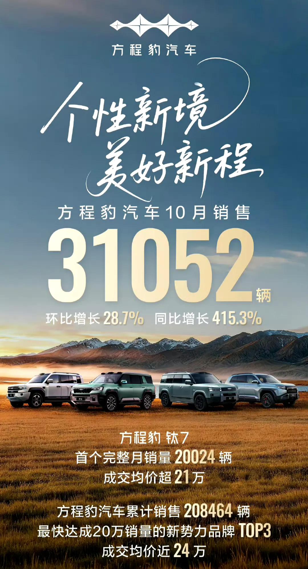 十年前的比亚迪被人戏称“比三万”,如今比三万变成了豹三万,迪子的方程豹品牌10月销量破3万,定位个性潮玩的方程豹品牌起初被认为是比亚迪的高端品牌,比如卖30万的豹5和40万的豹8,随后推出了13万的钛3和17万的钛7,虽然拉低了售价,却爆了销量。你们认为方程豹到底是不是高端品牌?大家怎么看?