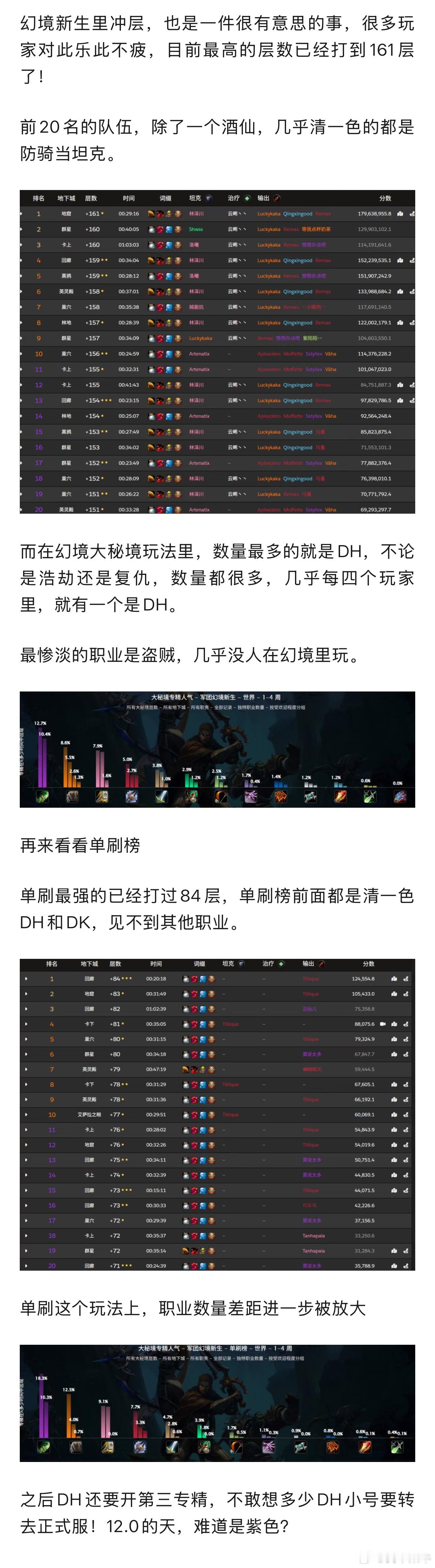 幻境新生里冲层,也是一件很有意思的事,很多玩家对此乐此不疲,目前最高的层数已经打到161层了!前20名的队伍,除了一个酒仙,几乎清一色的都是防骑当坦克。