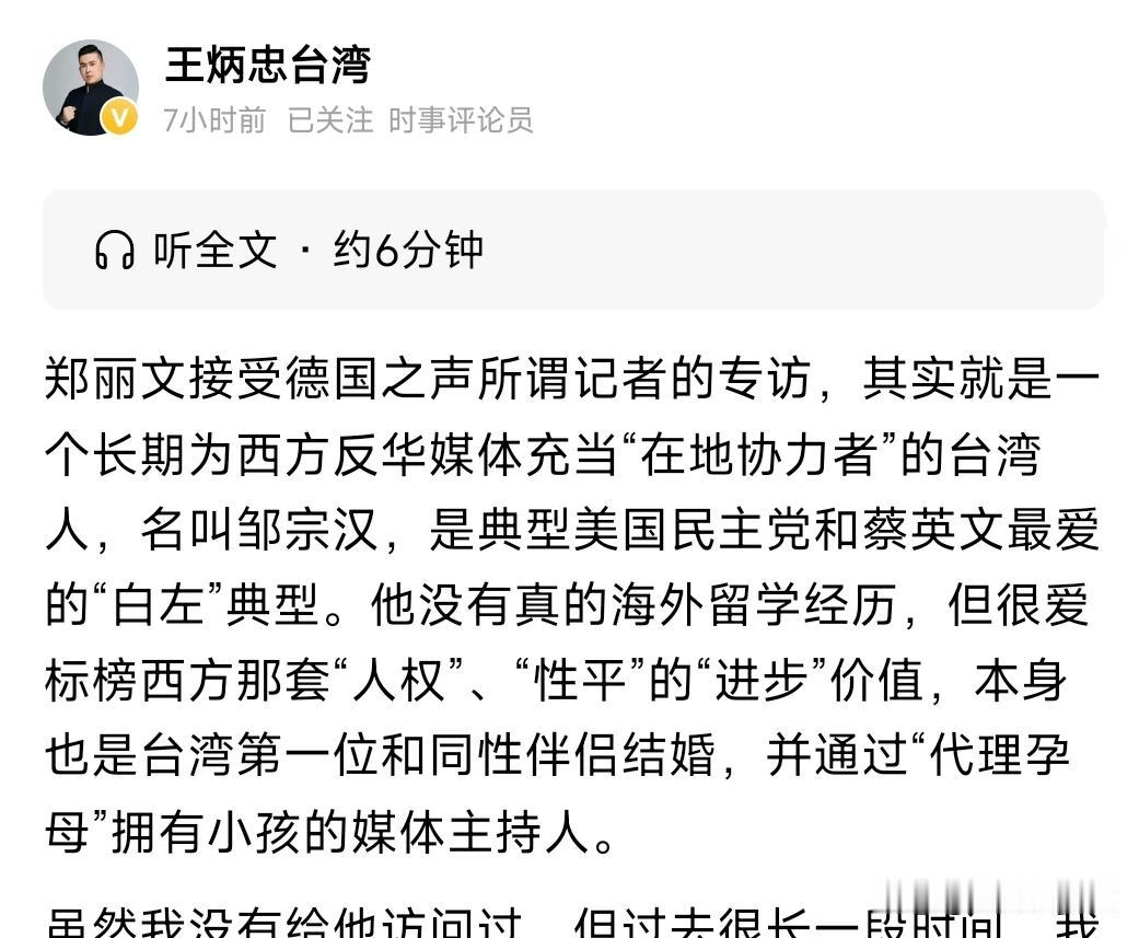 王炳忠这段文字的信息量也太大了。原来那个采访郑丽文的德国之声记者,人品这么烂?岛内人,帮西方反华媒体干活,没真才实学还瞎吹,做专访还故意带偏节奏,太不地道了! 但他的反噬也来了,舆论直接向他开怼,还被迫关闭了评论区。