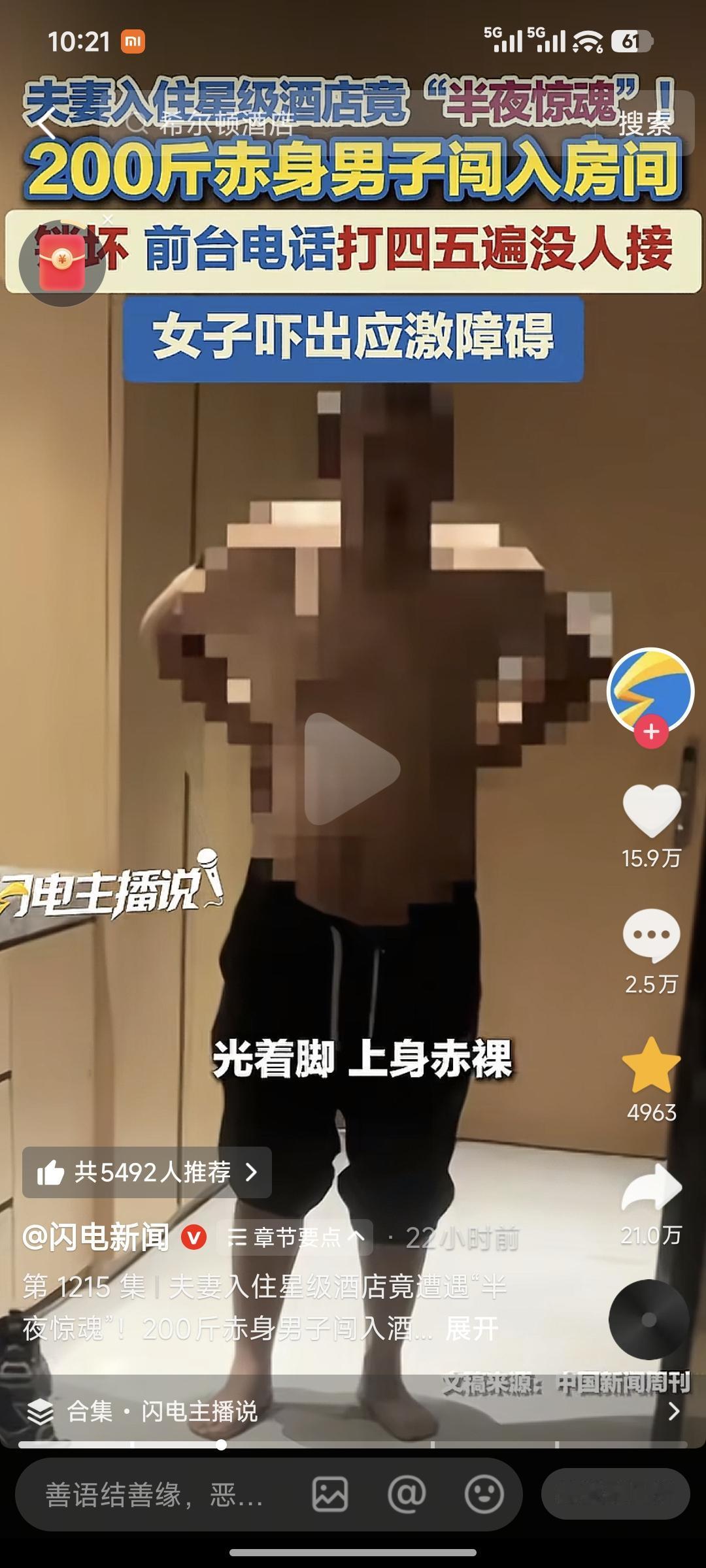 第一种发错房卡情况!!! 200斤男子刚到酒店 被发错房卡 进到房间 住酒店半夜出现偷窥狂还赤裸!!!!! 此时绝不应该什么衣服都没穿 脚上没穿鞋 第二种发错房卡情况 200斤男子在自己房间光着上身 从自己房间临时出来要拿外卖或者 要去洗衣服等事情 后发现忘带房卡找前台重新补卡结果发错 但是绝不可能不穿鞋出来 希尔顿酒店管理缺失 这个人有重大嫌疑 查他手机 转账记录 看看酒店和他是不是长期进行这种操作 酒店巨额赔偿 当事人巨额赔偿 如果不严肃处理 以后这种事越来越多 女性安全没有保障 女性觉得社会不再安全 就不会考虑生孩子 没有小孩 国家就没有未来 国家老龄化 女性安全尤为重要 [微笑他光脚 是因为光脚走路没声!!!!没声!!!!! 摸错门酒店 带错卡牌