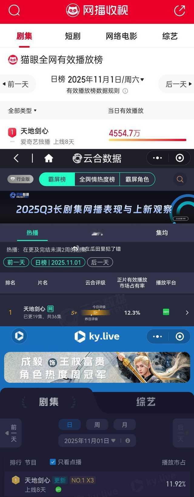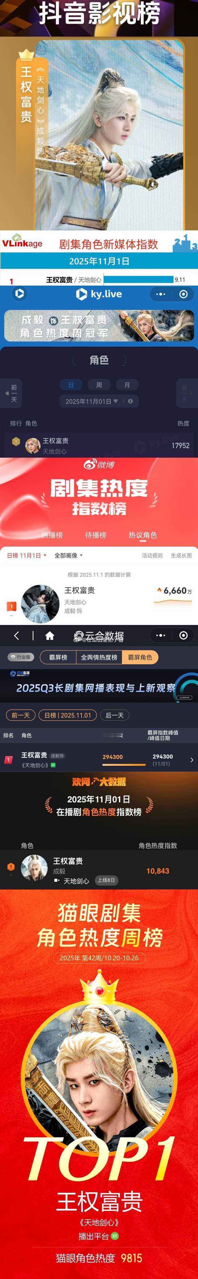 成毅王权富贵霸榜抖、V榜、酷云、猫眼、微博、欢网、云合全网各大平台热度第一🔥人抬剧天地剑心蝉联登顶全网播放量第一!