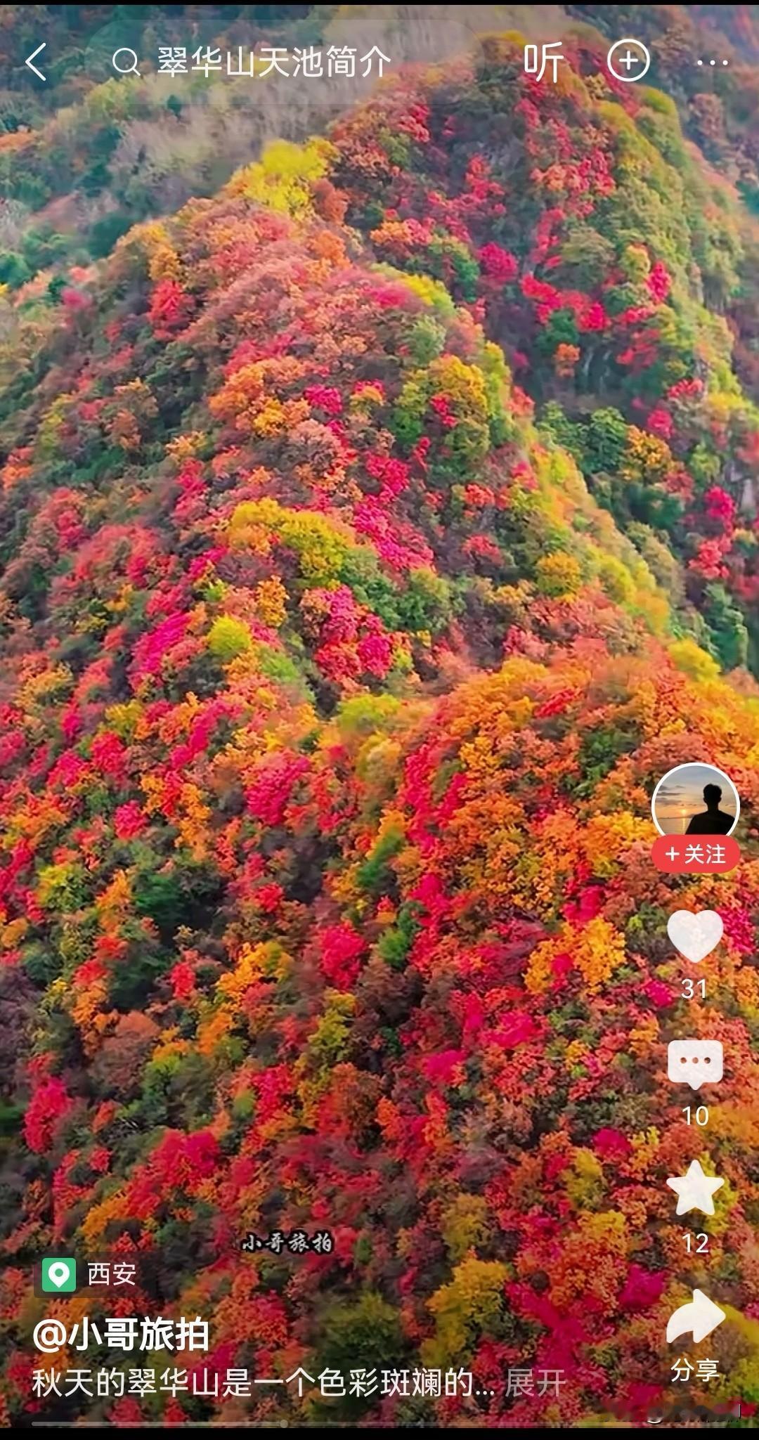 谁能想到,深秋的翠华山,简直就是打翻的颜料盘!周末正适合赴一场秋日之约。放眼望去,目之所及尽是斑斓色彩,顺着起伏山势铺展蔓延开来,只见层林尽染,美不胜收。这样的秋日盛景,你爱了吗?(图片来自网络)秦岭翠华山 翠华山自驾游 翠华山旅游 翠华山雪 翠华山春雪 夜爬翠华山 翠华山登山赛