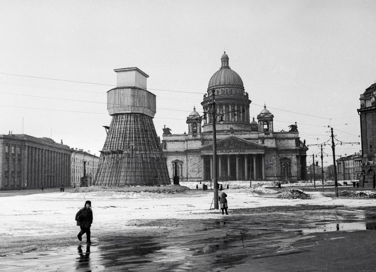 围困时期的列宁格勒,沃罗夫斯基广场(现名伊萨基辅广场)全景。画面远景矗立着伊萨基辅大教堂,广场中央竖立着尼古拉一世骑马雕像——整座纪念碑被密封在防护罩体内。 积雪覆盖的广场上,有轨电车轨道若隐若现,防空沙包堆叠在建筑四周,这座昔日帝都的繁华广场此刻在战火中仍旧保持着的庄严。 列宁格勒围城战是二战期间持续时间最长、最惨烈的围城战役(1941年9月8日-1944年1月27日),德军“北方”集团军群对这座城市实施了长达872天的封锁,导致超过100万平民死亡。 “沙皇尼古拉一世纪念碑”(参见图2)1859年落成,是俄罗斯帝国时期著名的工程艺术杰作,而且是世界上首座仅凭两条支点保持平衡的骑马雕像,雕塑家是彼得·克洛特,其底座四角浮雕分别象征“正义”“力量”“智慧”“信仰”。