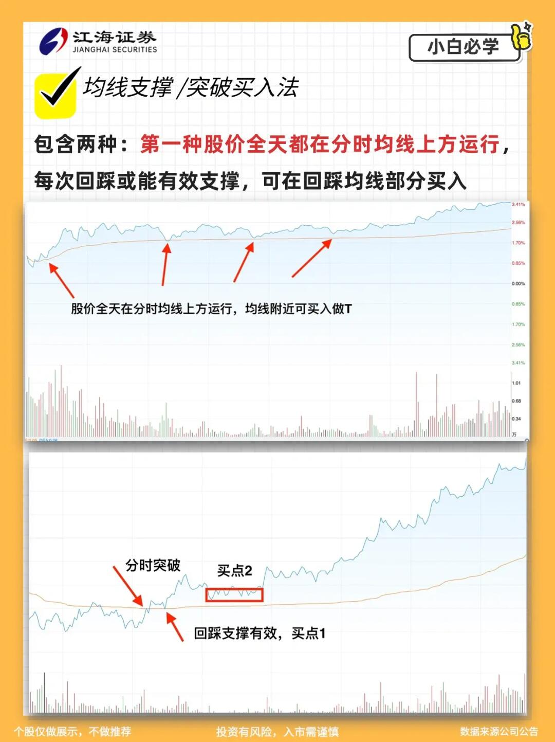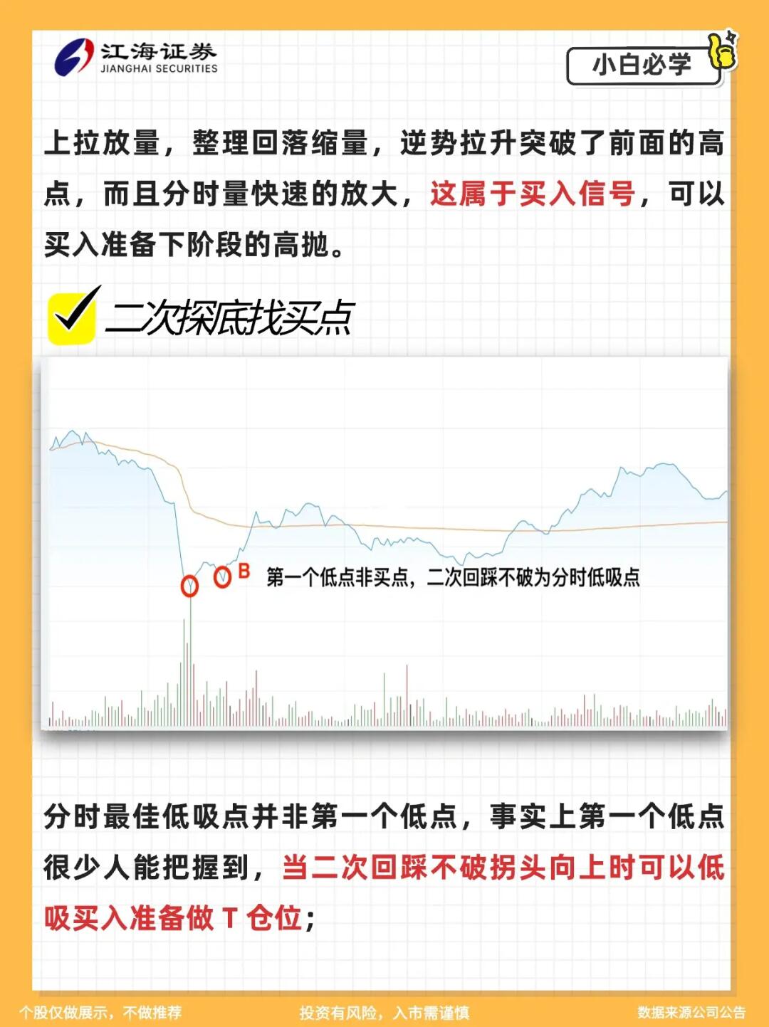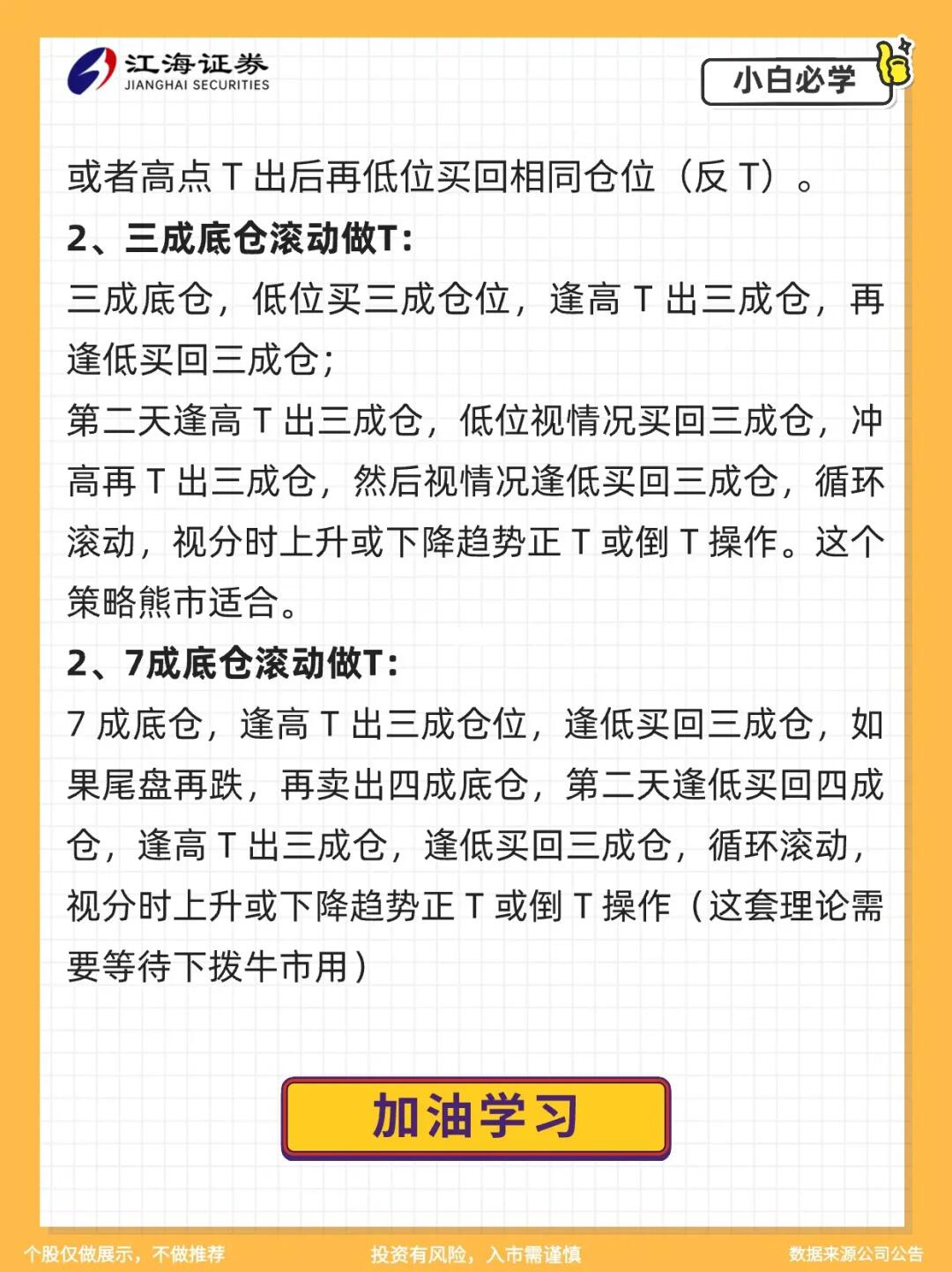分时做T要点 1、做T要大盘和个股分时线结合看; 2、早盘的波动较大(十点前最甚),不确定性高,可能成功率也高;中午和下午收盘前慎重做工,有主力就喜欢尾盘偷袭。 3、强于大盘的行业和个股要防止T飞,龙头要谨慎做工,如果买了跟风股,可以参考龙头的走势做 T,妖股不要轻易做工(很容易直线秒板,不给参与机会),做错了就买不回来………更多🉑️学