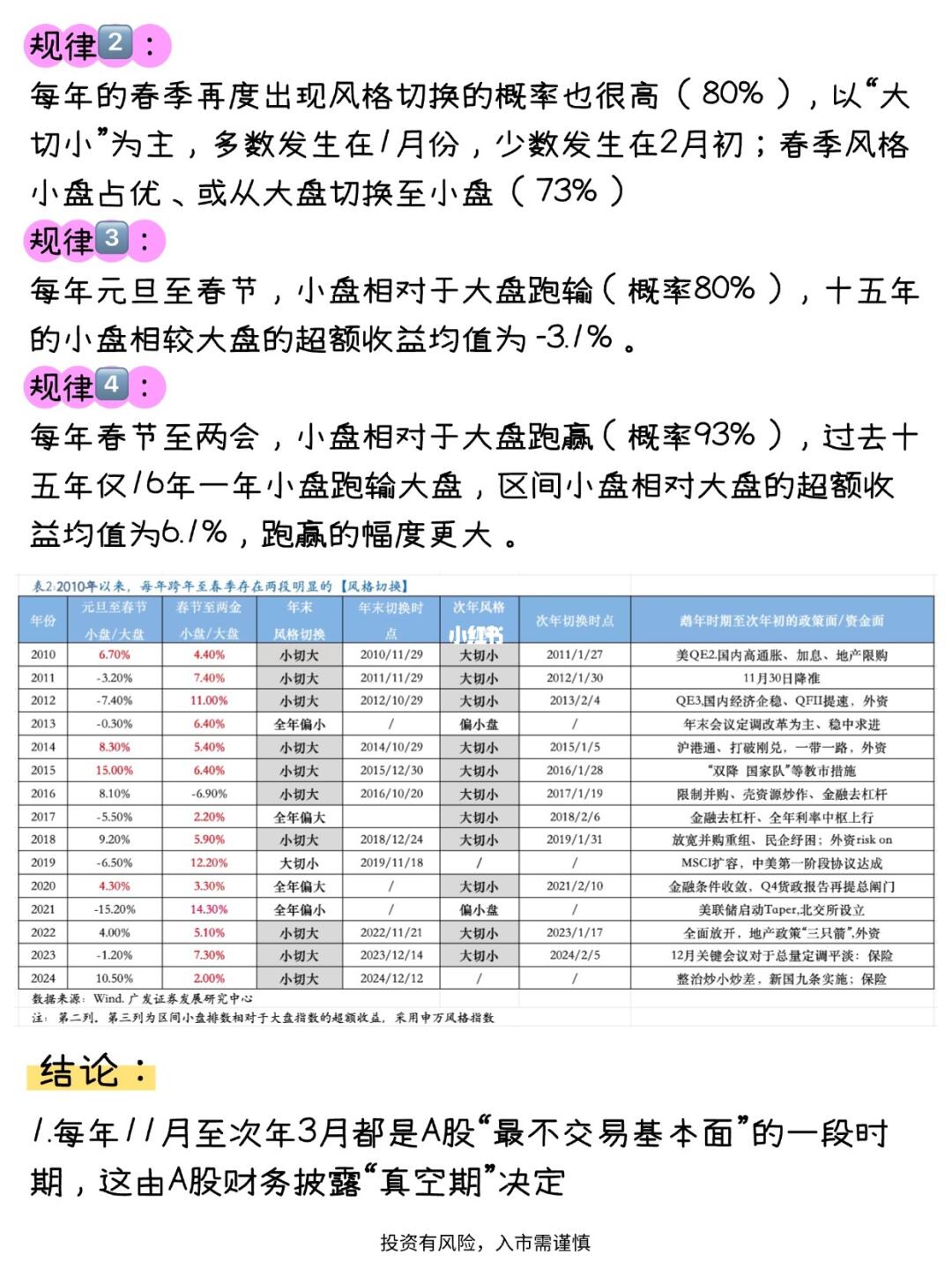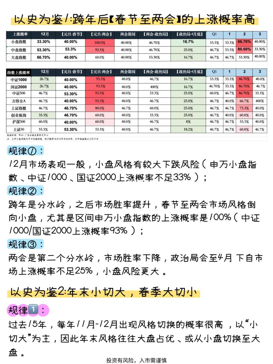 跨年是分水岭,之后市场胜率提升,春节至两会市场风格倒向小盘,尤其是区间申万小盘指数的上涨概率是100%(中证1000/国证2000上涨概率93%);