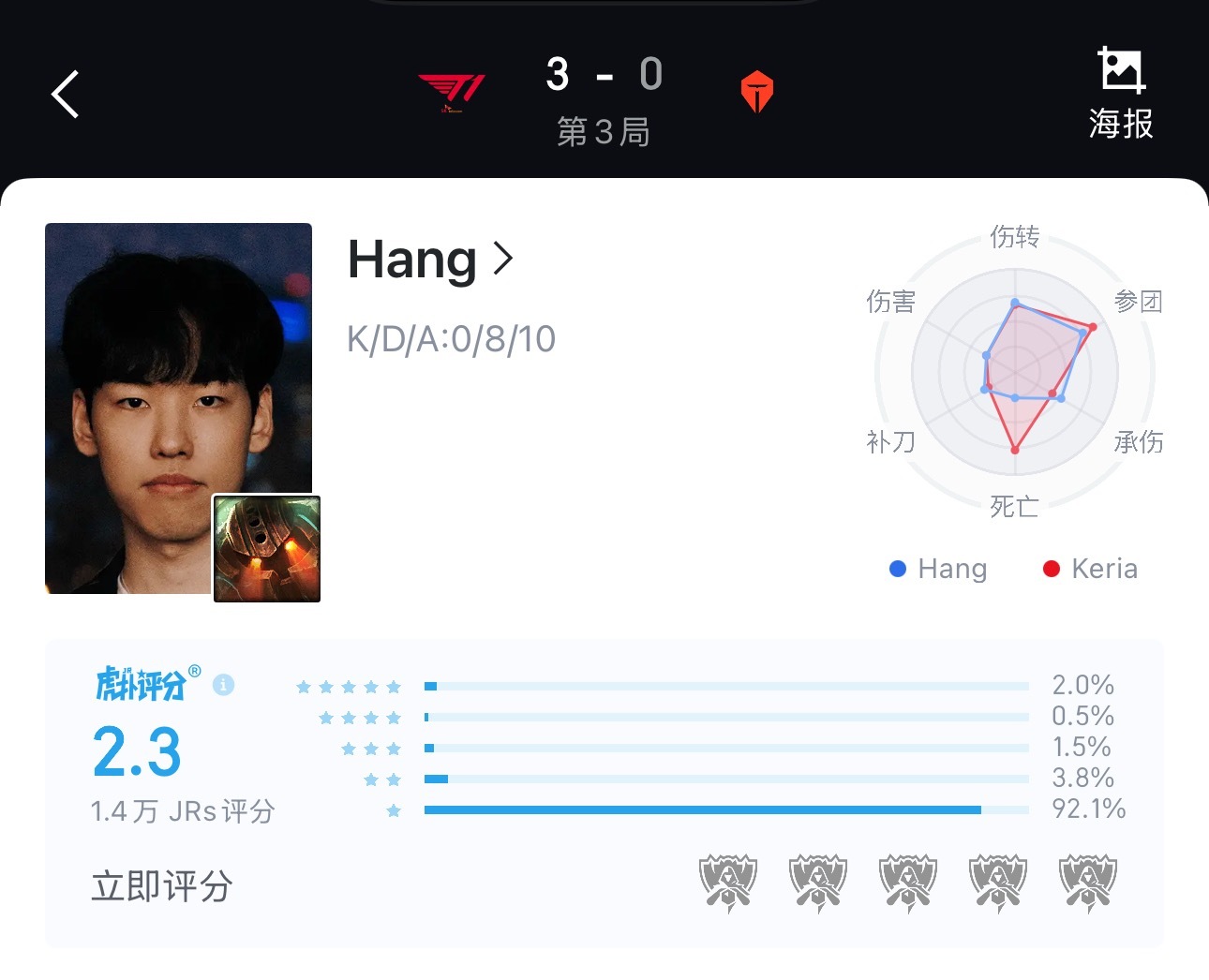 专门打T1的GenG回家了,滔博如果明天赢不了的话,我估计T1真要三连冠了。不得