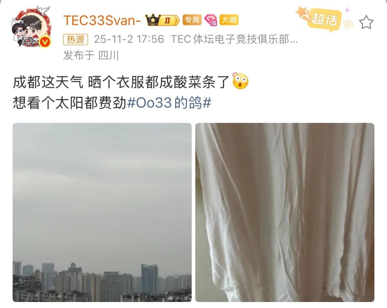 成都的天是酸菜天,33的衣是酸菜条~这天气晒衣,主打一个“酸”爽体验,太阳你快出来救救急!