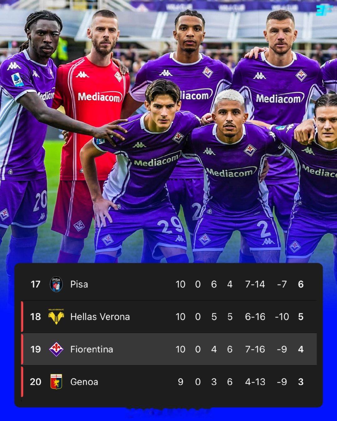【佛罗伦萨10轮不胜】由皮奥利执教,拥有德赫亚、哲科、莫塞伊-基恩、戈森斯、法吉奥利等实力派球员的佛罗伦萨,本赛季意甲前10轮,4平6负难求一胜,积分榜排名第19位,深陷降级漩涡。意甲联赛