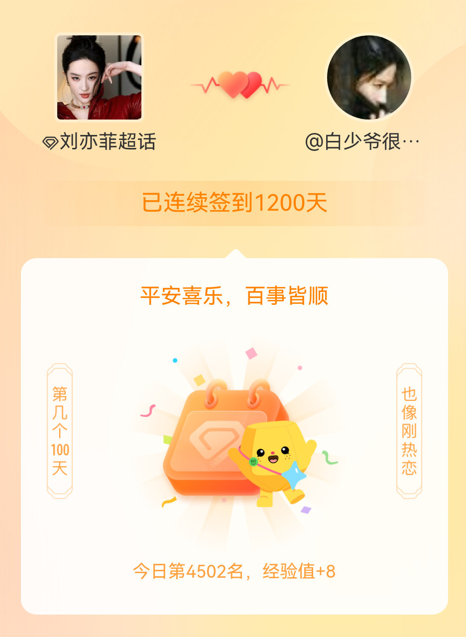 刘亦菲[超话]我在刘亦菲[超话]连续签到1200天啦,百看不厌,久处亦欢~