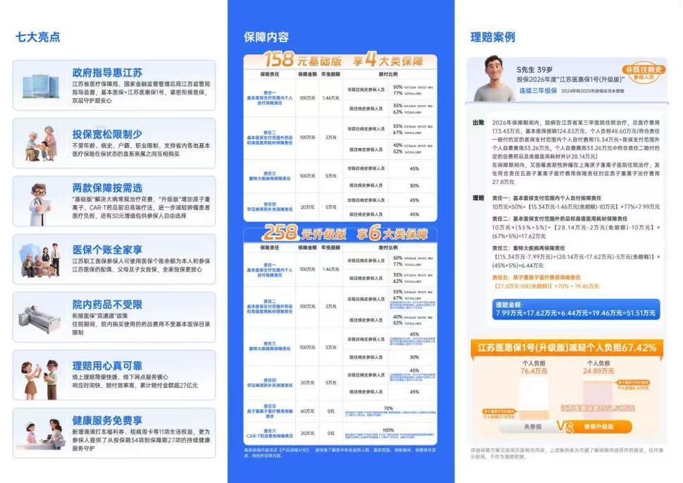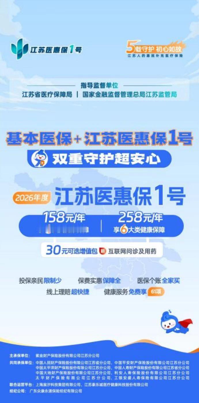 江苏人的健康“兜底神器”——2026 江苏医惠保 1 号来啦! 概述:还在为医疗保障担忧吗?2026 年度江苏医惠保 1 号火热来袭,医保个账全家投保超省心,亮点多多,快来了解! 在江苏生活,医疗保障可是大家都关心的大事。今年是“江苏医惠保 1 号”上线的第五年,给咱带来了满满的福利,而且现在参保正在火热进行中,大家千万不要错过。 “江苏医惠保 1 号”可是在江苏省医疗保障局、国家金融监督管理总局江苏监管局指导监督下推出的,有政府把关,品质可靠 。由 9 家保险公司共同承保,还有宸汐健康提供运营支持,为全省人民的健康保驾护航。 它的优点那可真是数都数不过来。投保条件特别宽松,不管你年龄多大、有没有病史、户籍在哪、从事什么职业,只要是江苏省内各地基本医疗保险在保状态的人都能投保,而且还支持直系亲属之间互相购买。 有两款保障方案供大家按需选择。“基础版”能解决大病常规治疗的花费;“升级版”更厉害,增加了质子重离子、CAR - T 药品这些前沿高端疗法的保障,进一步减轻肿瘤患者的医疗负担,还有 30 元增值包可以自由选择。 医保个账全家享这个福利也超赞!江苏职工医保参保人能用医保个账余额为本人以及参保江苏医保的配偶、父母、子女投保,全家一起投保,更安心。 住院期间用药也方便,衔接医保“双通道”政策,院内购买使用的药品费用不受基本医保目录限制。理赔服务也很用心,线上理赔简便快捷,线下网点服务暖心,响应快、赔付效率高,累计赔付金额超 27 亿元,实力有目共睹。 而且现在还能免费享受健康服务,新增加了滴滴打车福利券、视频周卡等 11 项生活权益,还有从投保期到保障期的持续健康服务守护。 从 2025 年 9 月 23 日到 12 月 31 日都能参保,保障时间是 2026 年 1 月 1 日至 12 月 31 日,江苏全省各地社会基本医疗保险在保人员都能享受这份保障。江苏的朋友们,赶紧为自己和家人安排上这份保障吧!
