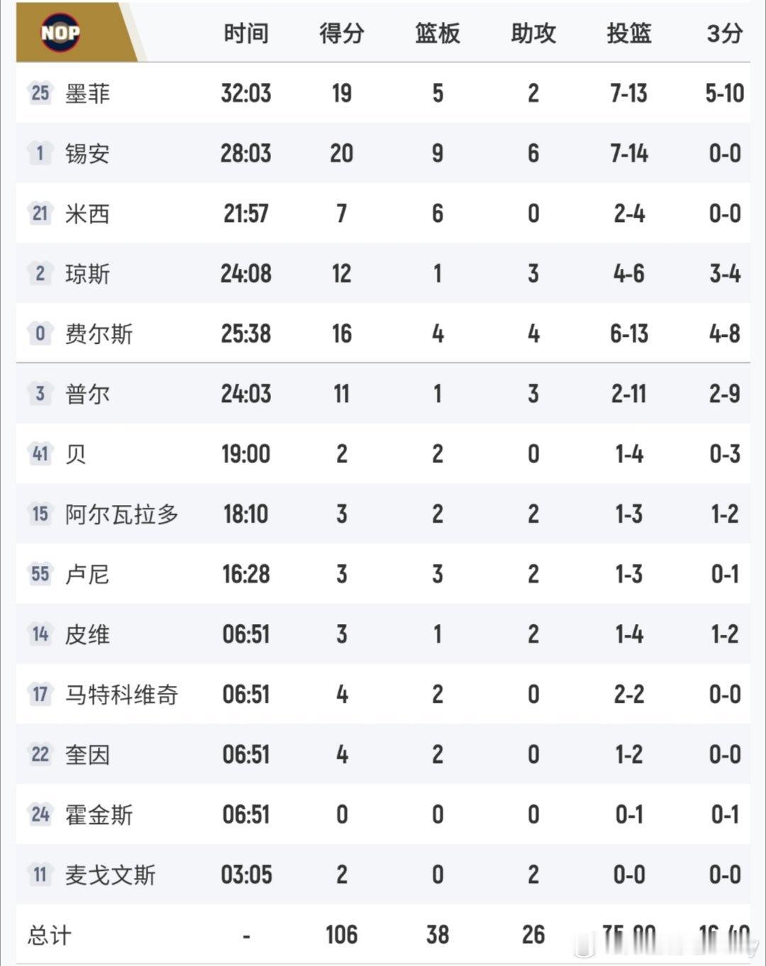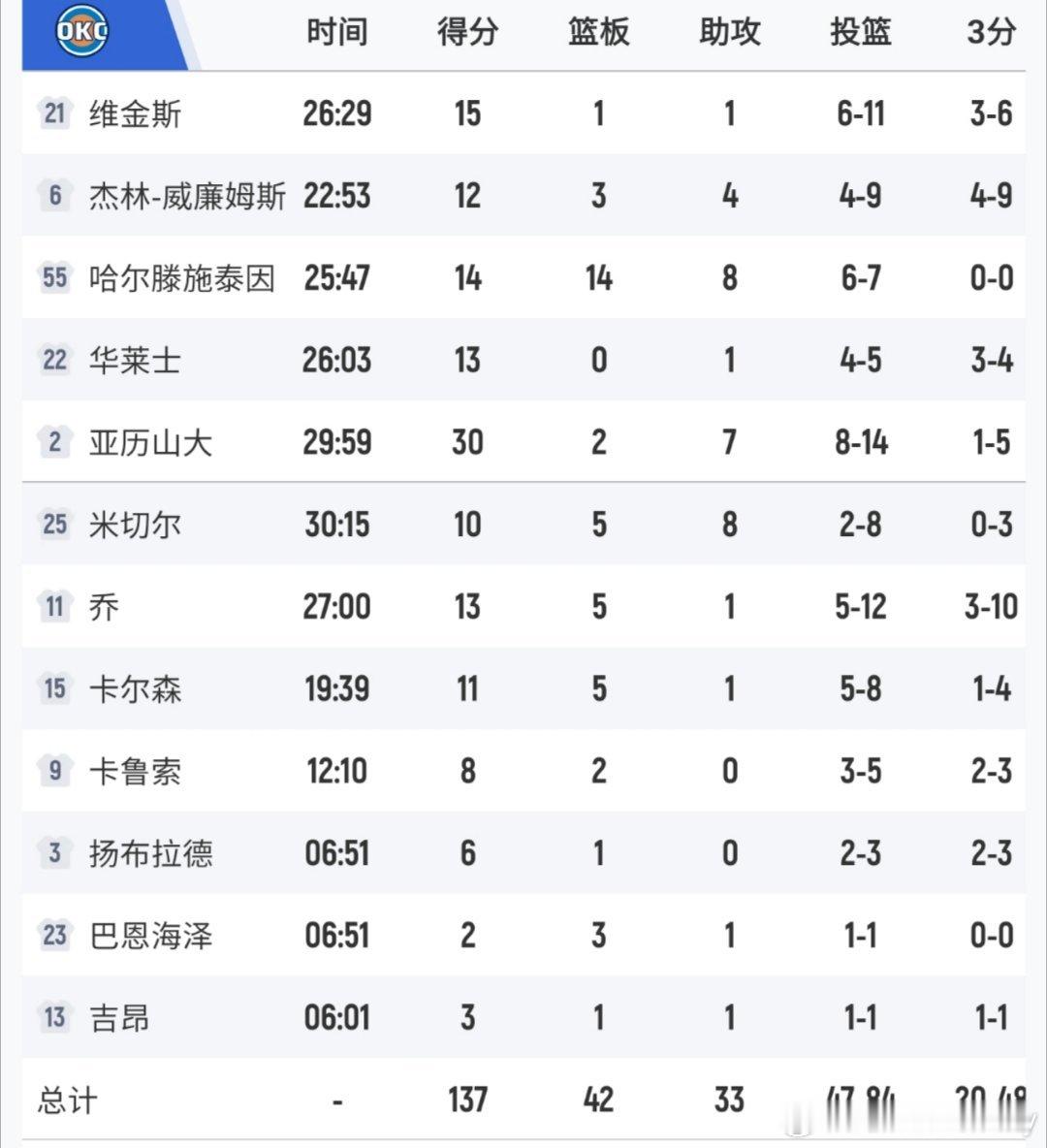 雷霆137-106鹈鹕,豪取七连胜,送鹈鹕六连败。