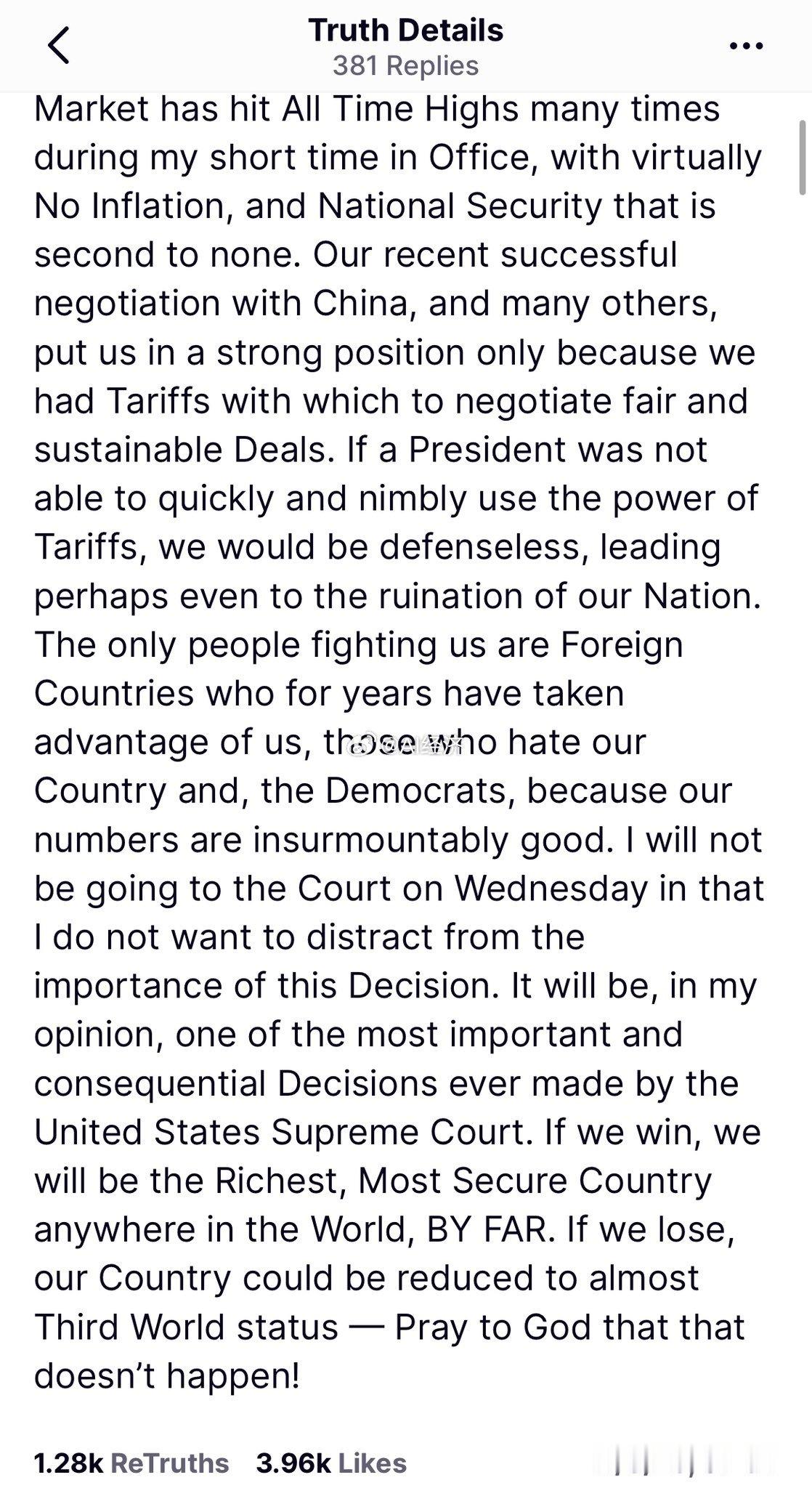 特朗普称不会出席本周最高法院就其全球关税措施合法性举行的听证会。